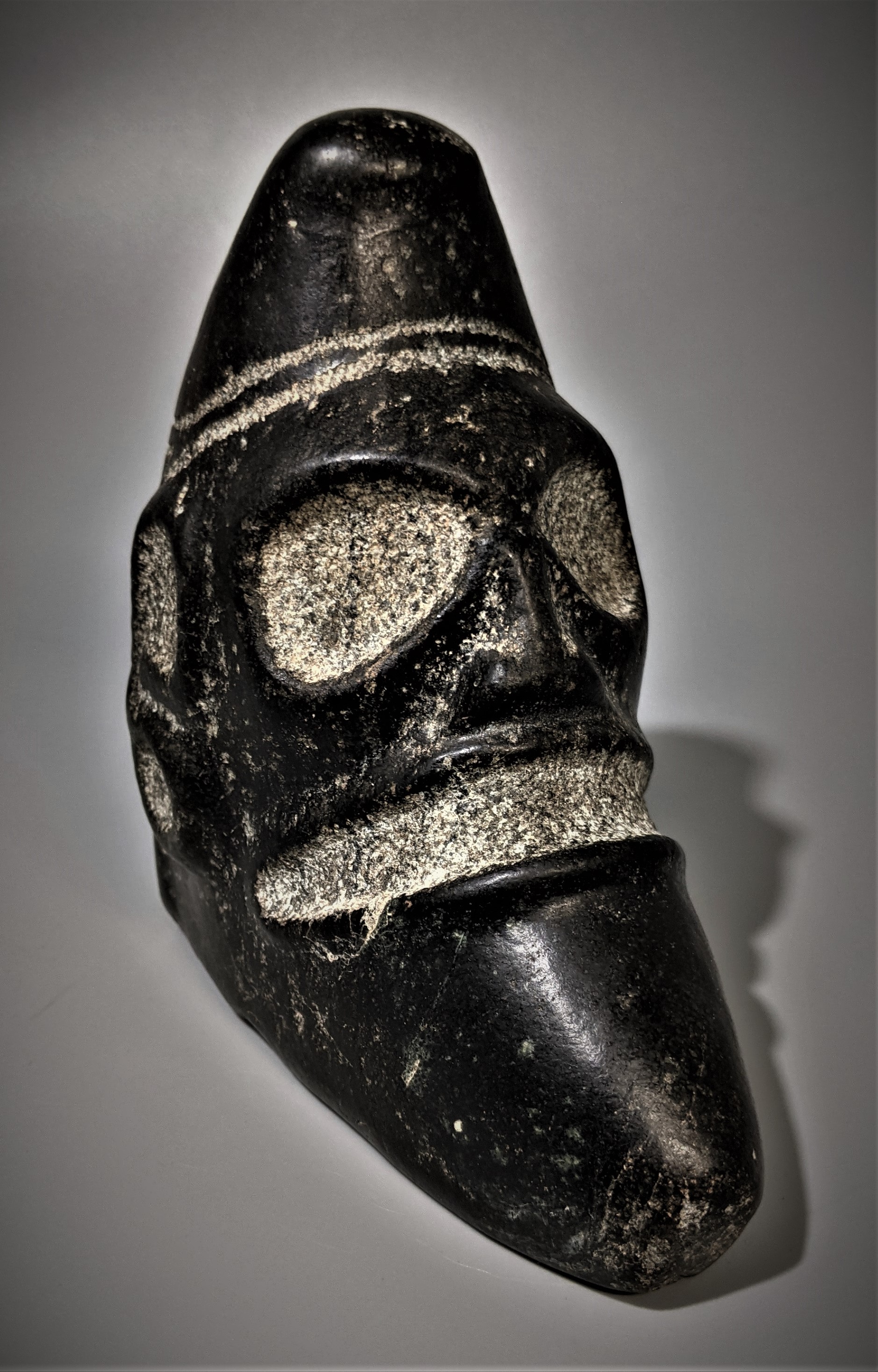 A medium large size, the black sea stone with polish surface. Pet carved features and voids. Nice condition with no modern polishing. 5 inches high and 7 inches across.