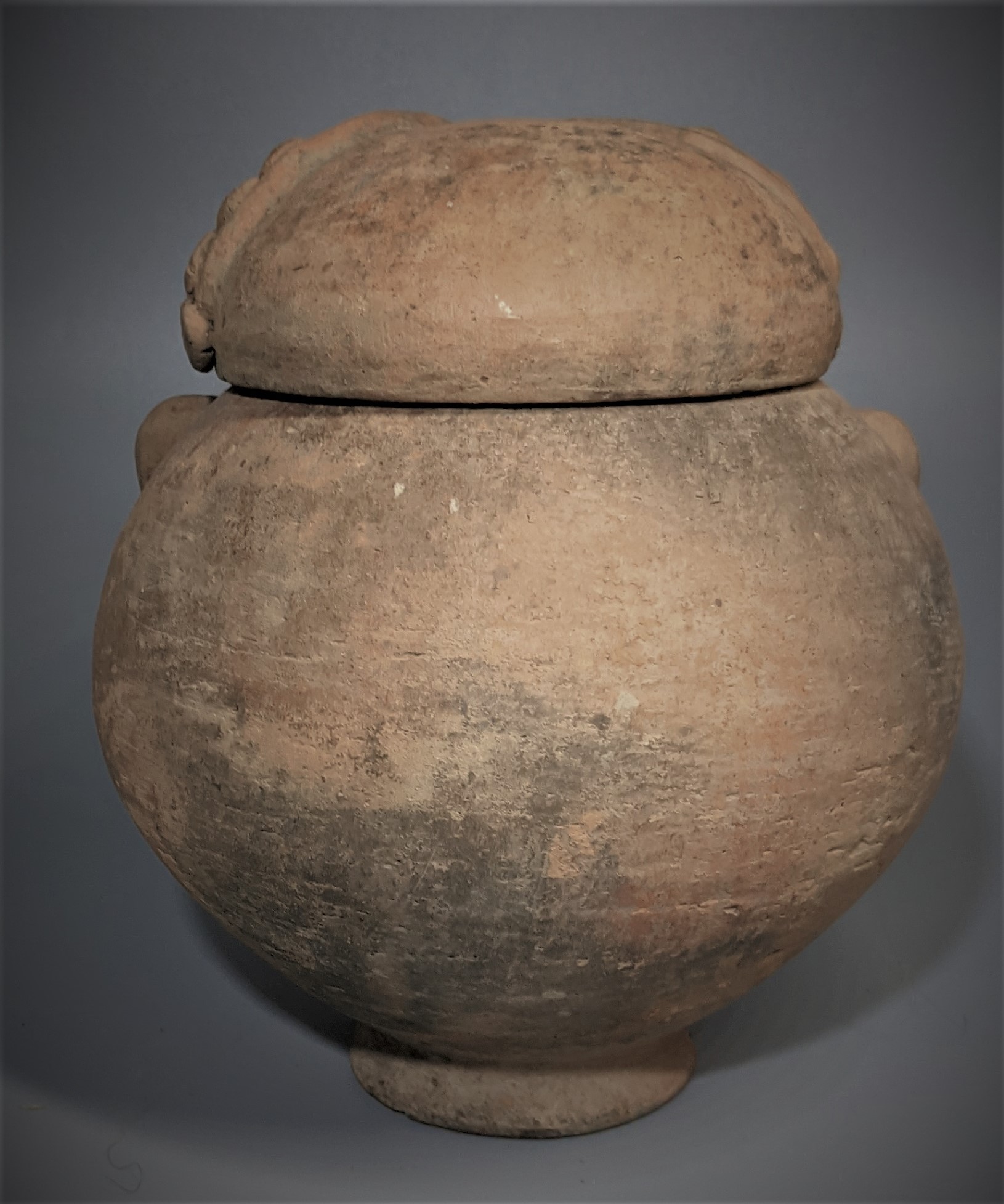 Mortuary this large ancient covered jar is just exceptional. A tight modest surface crack just above the foot rim. Otherwise mint condition and an untouched burial surface. About 8 inches high.