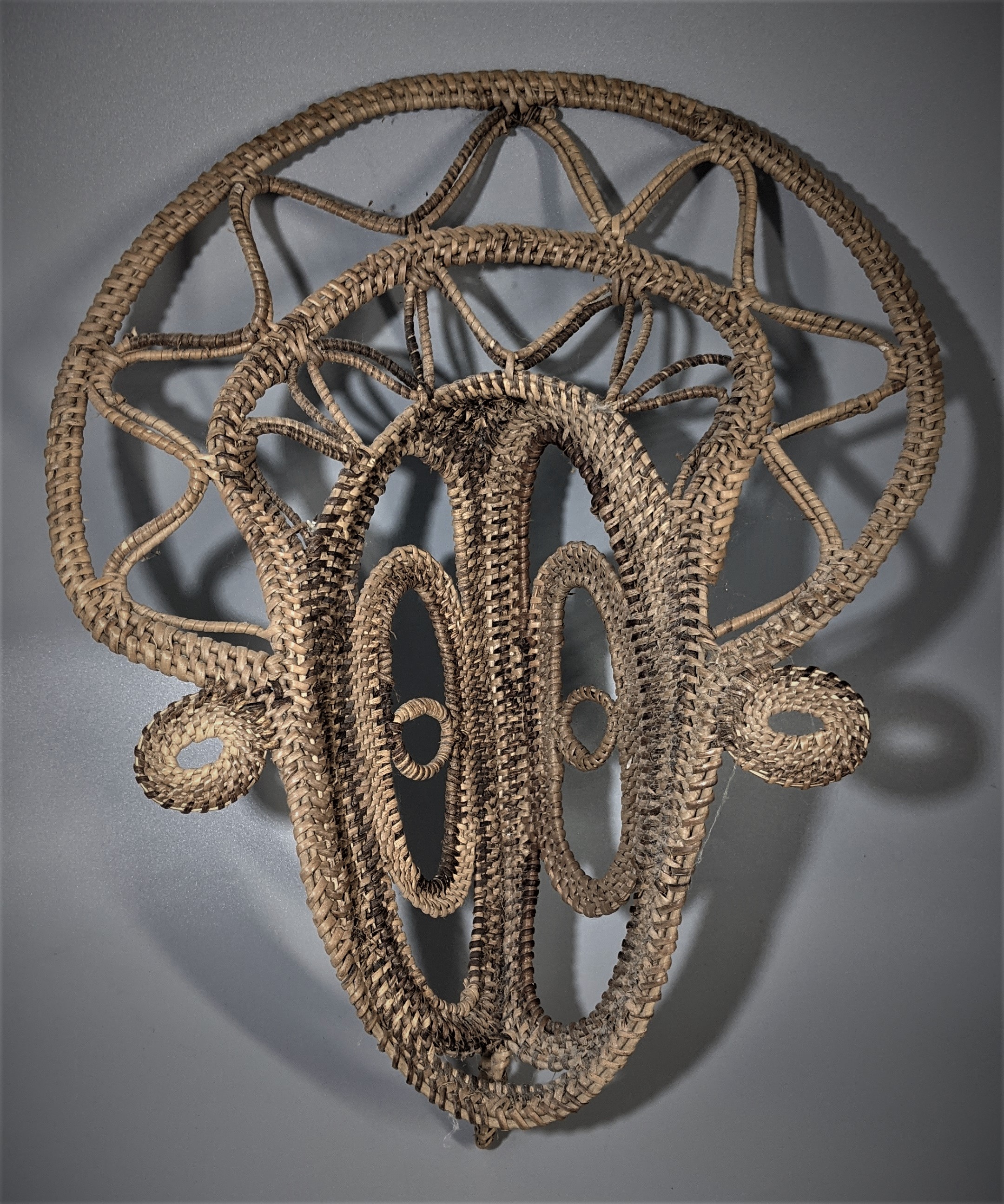 Crowned and with a hooked nose. Likely from the southern regions, Asmat. A beauty perfect in every way. Two color weavings. Circuit 1900. Museum candidate. 17 inches high and 13 1/4 wide.