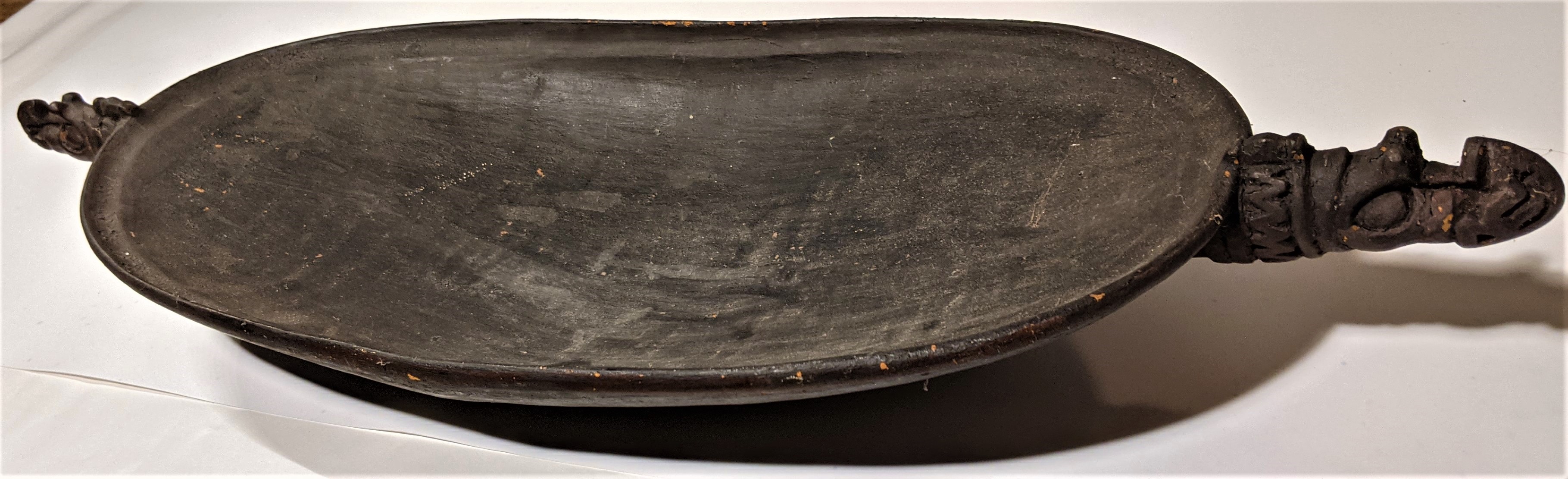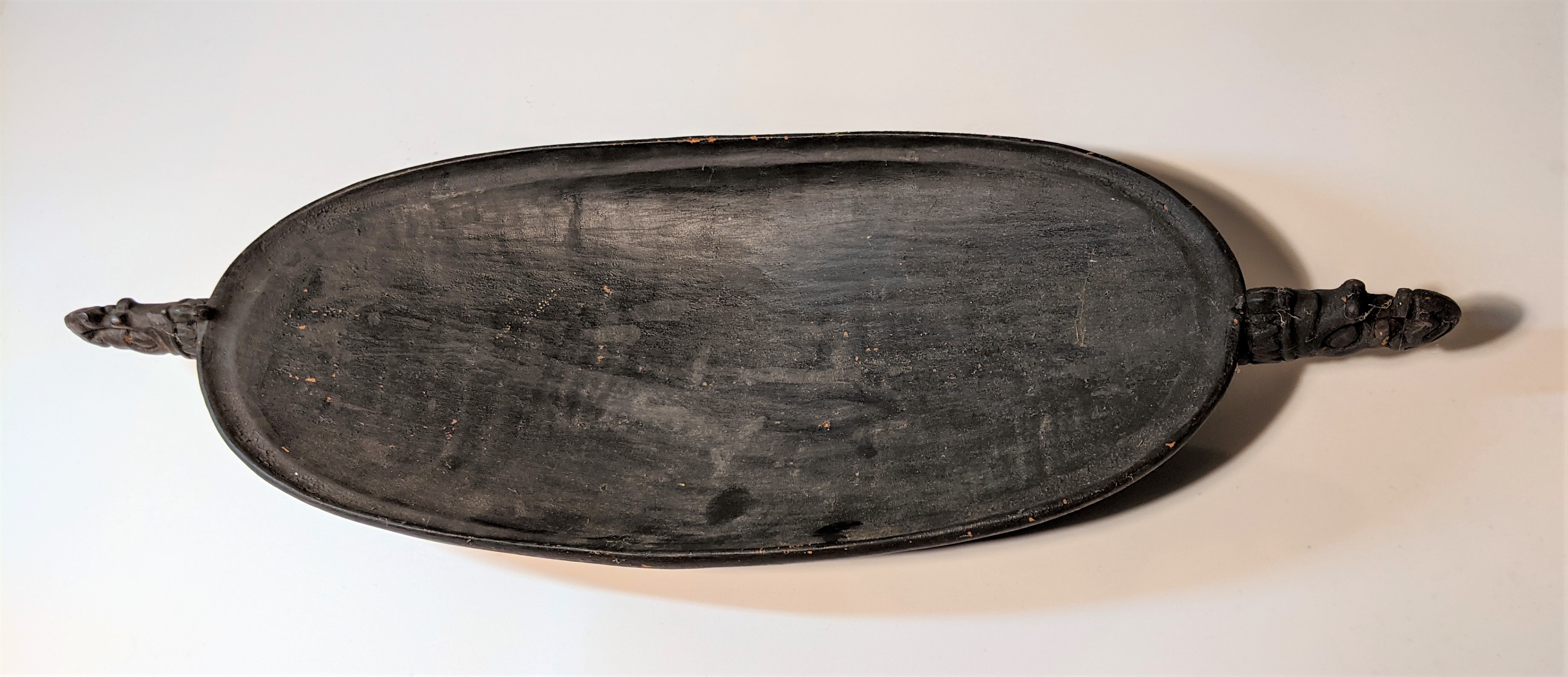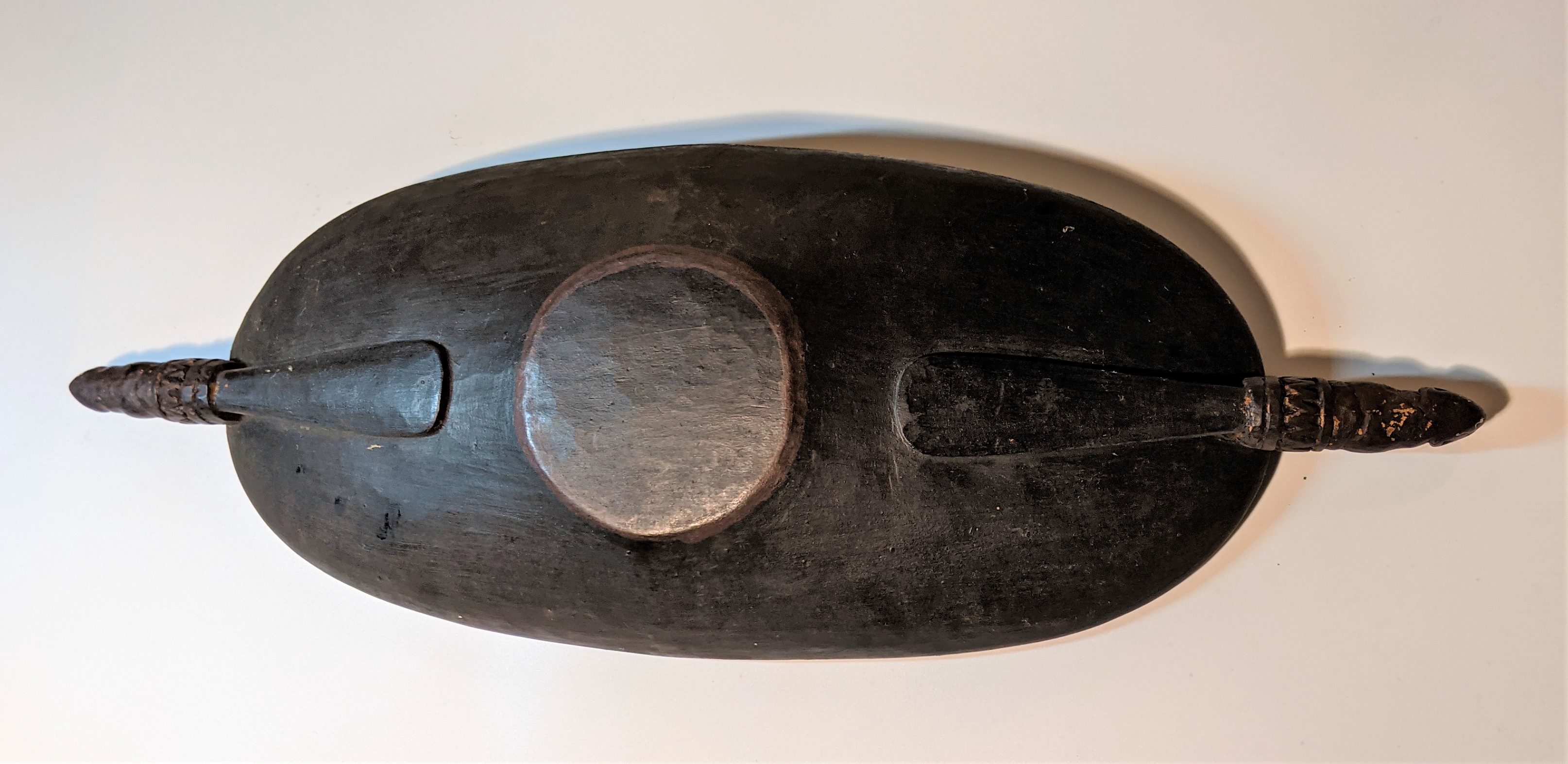 Antique 19th century, both ends carved with fierce zoomorphic humanoid heads. Dark natural surface patina very strong condition. Pacific islands. 30 inches long and 10 inches across.