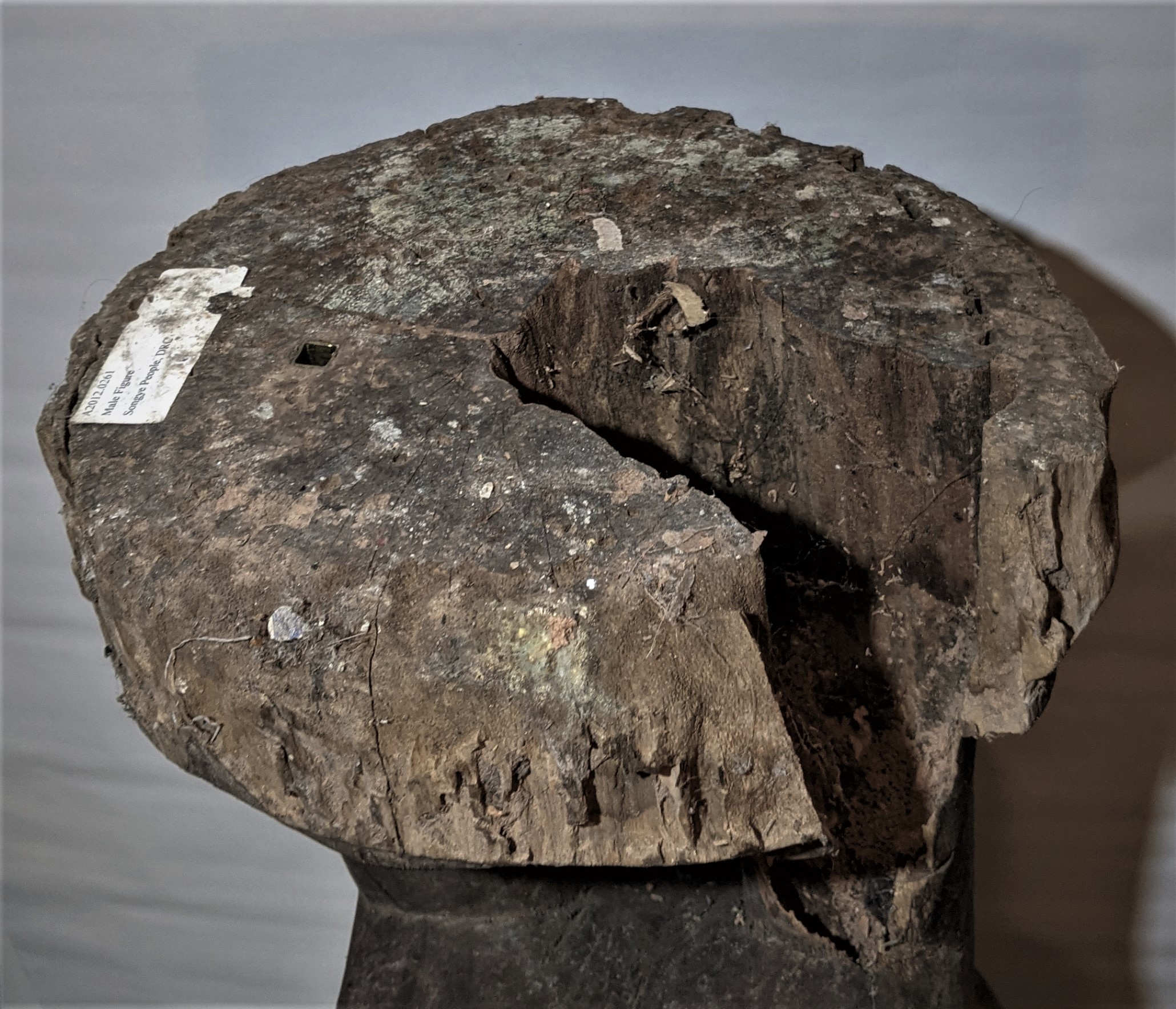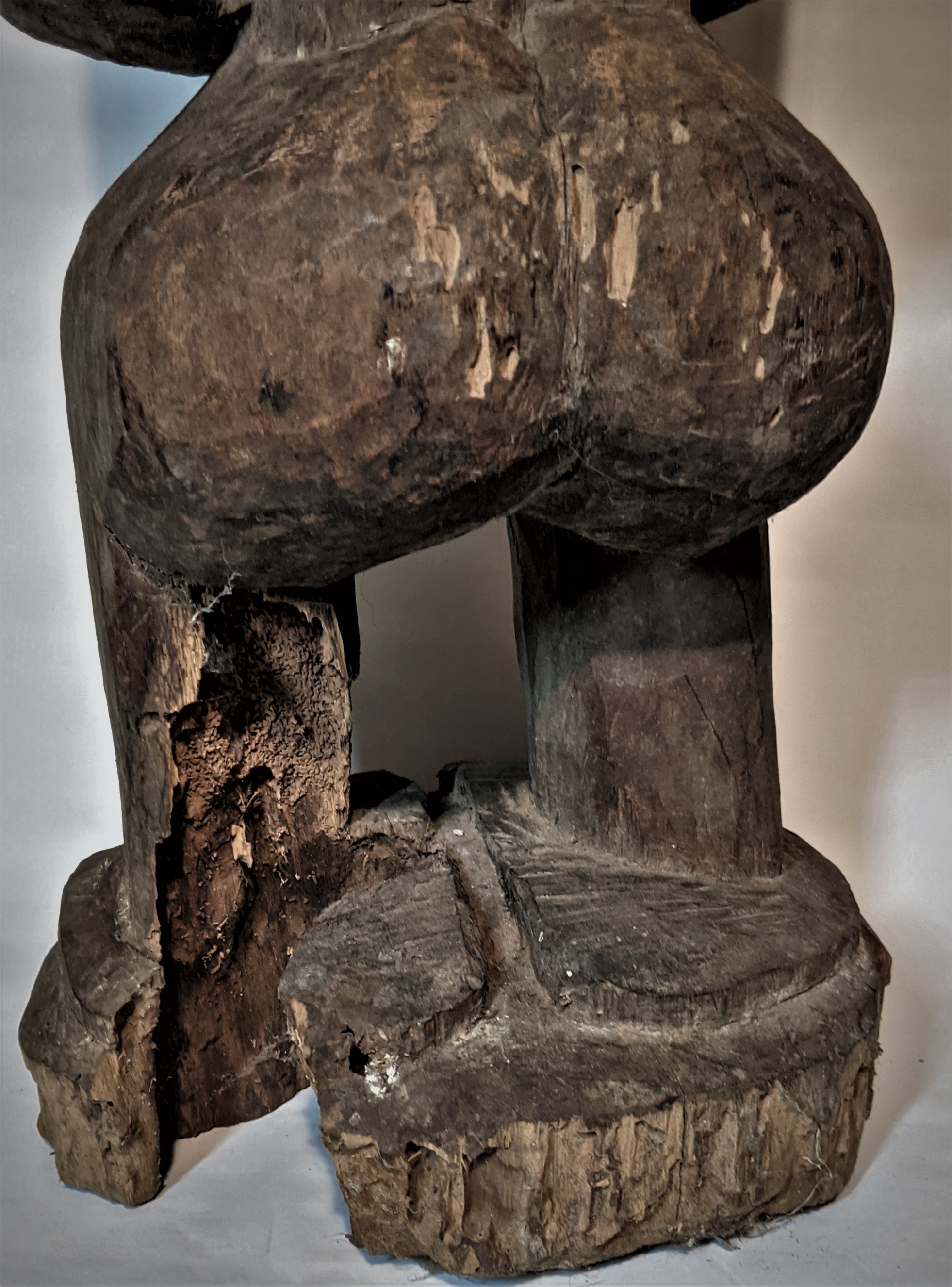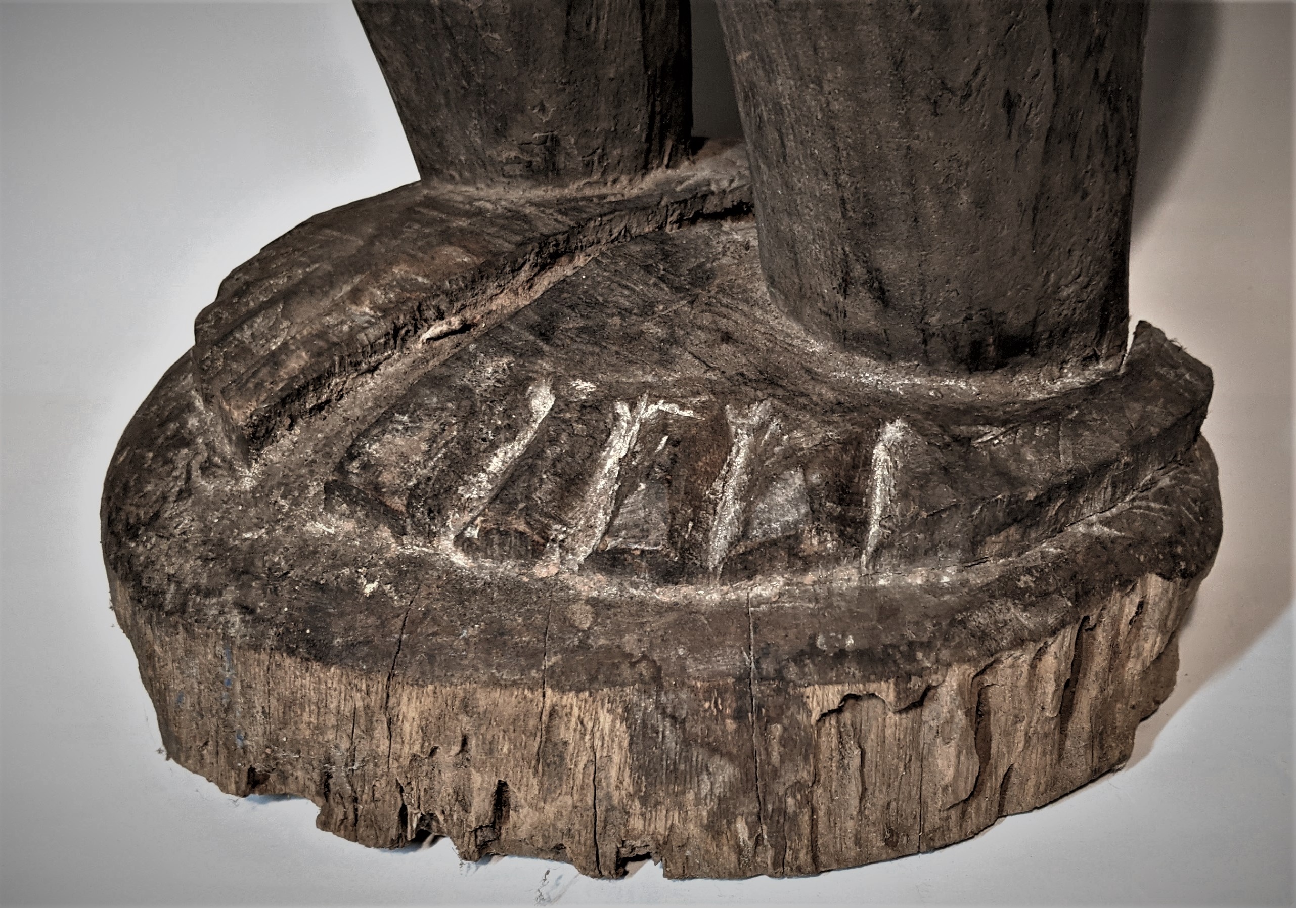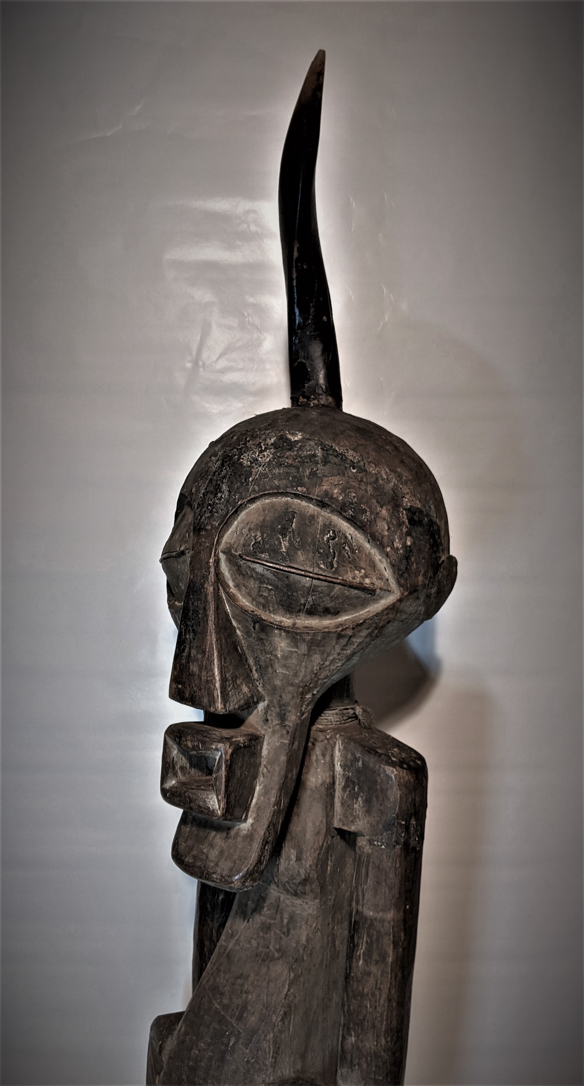Exceptionally bold head, last half of the 19th century. With animal horn attachment. Natural deterioration on the back of the head and a split at the back of the base, otherwise fine condition. A powerful figure of dense and very heavy wood natural, untouched surface. Ex Massachusetts museum. 47 inches high.