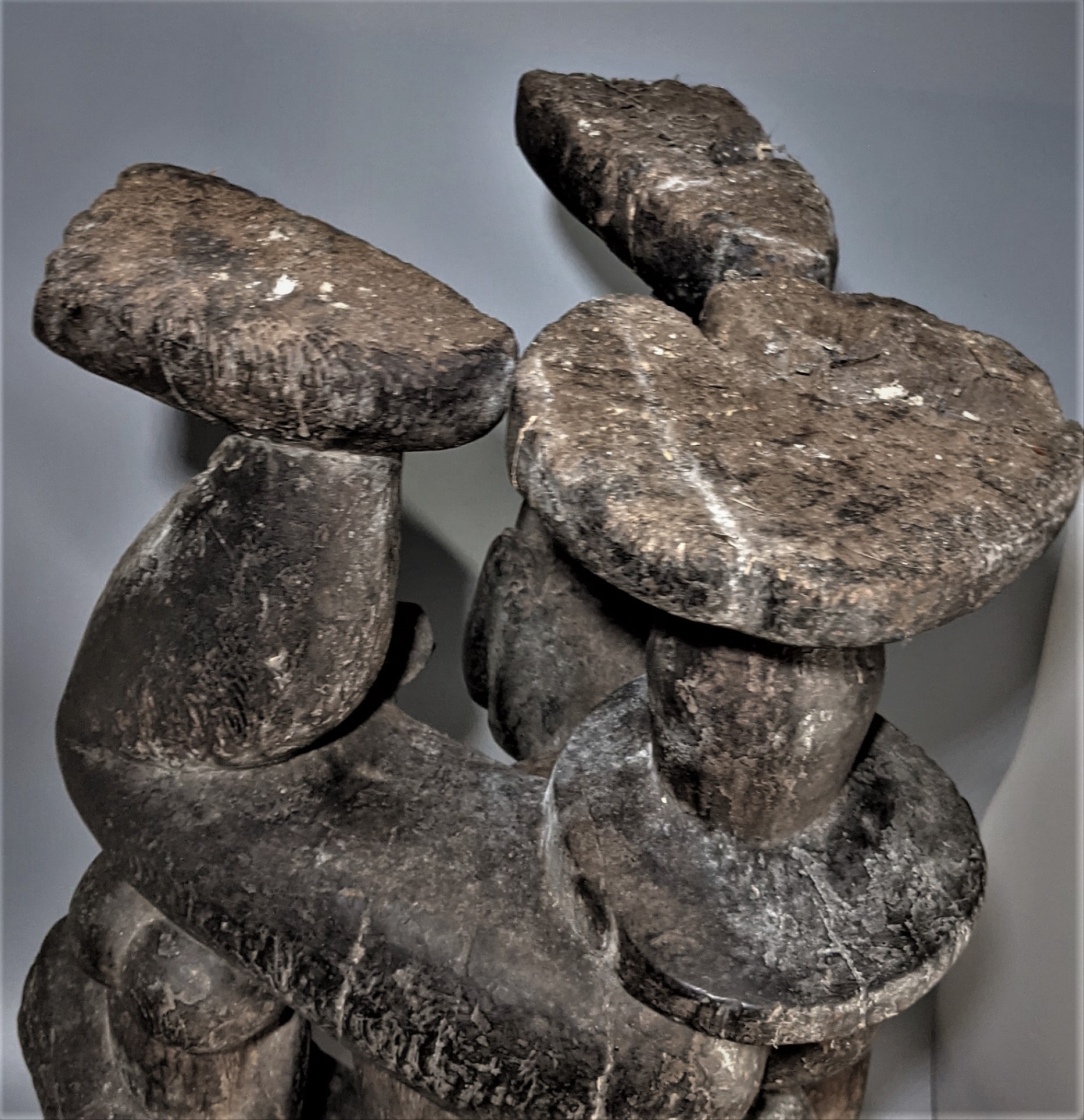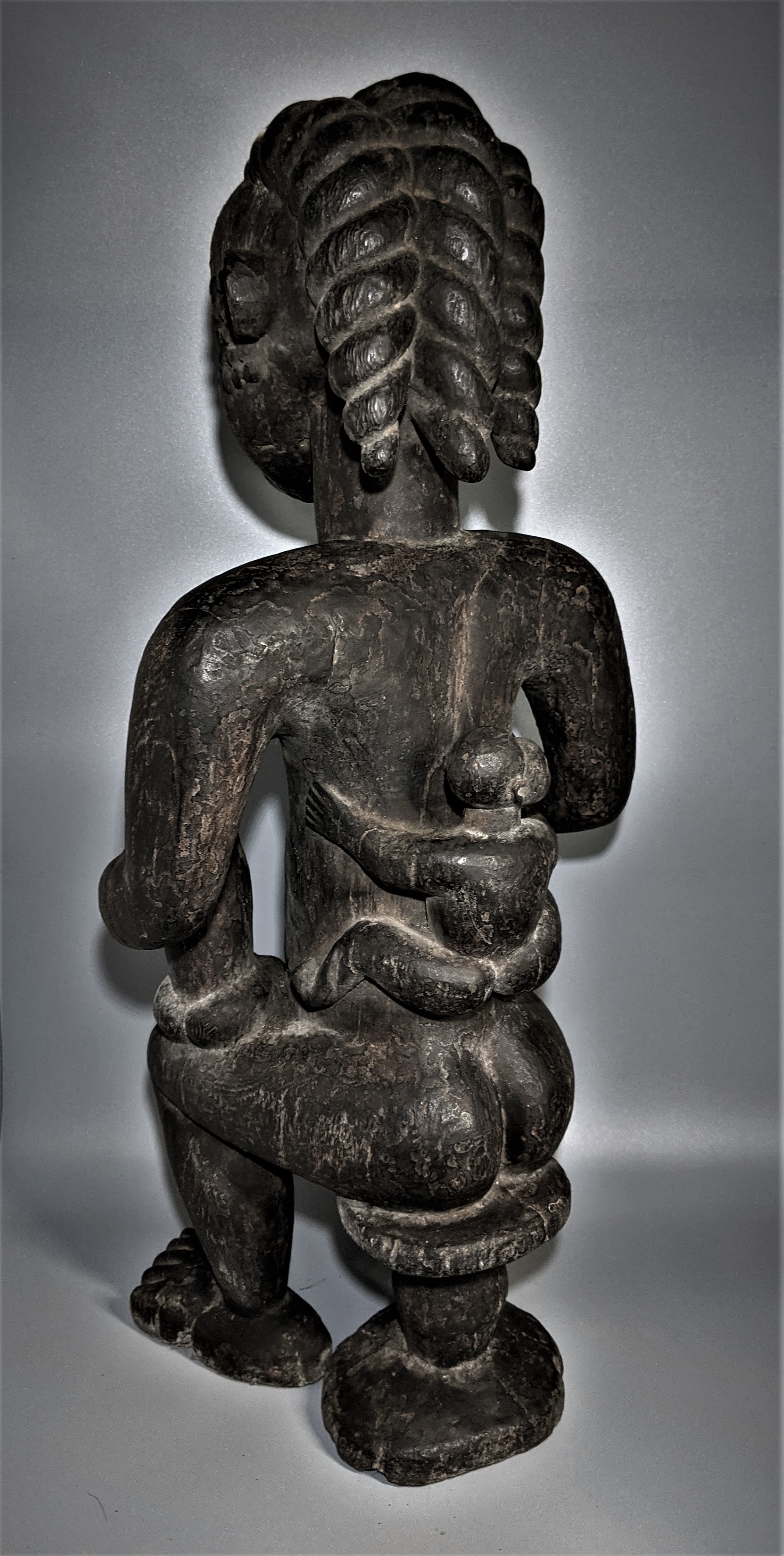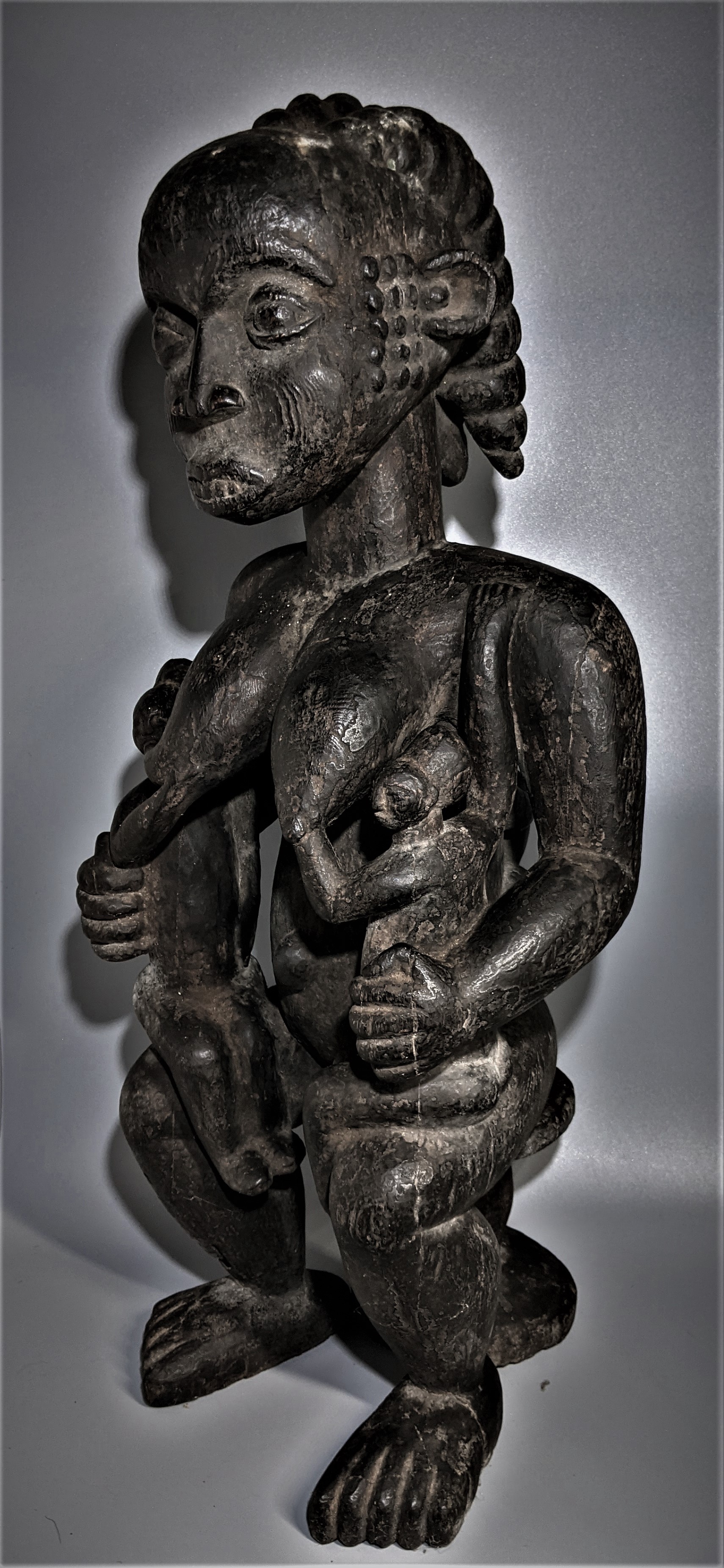 Seated , this very old figure holds a child on both knees. One suckling, the other one is playing with her breast, and a third hugs onto her back. Likely Zaire, Central Congo. Very rich dark untouched patina. Ex Massachusetts museum (at very high cost). Tribal identifying tags missing. Superb condition. 27 inches high.