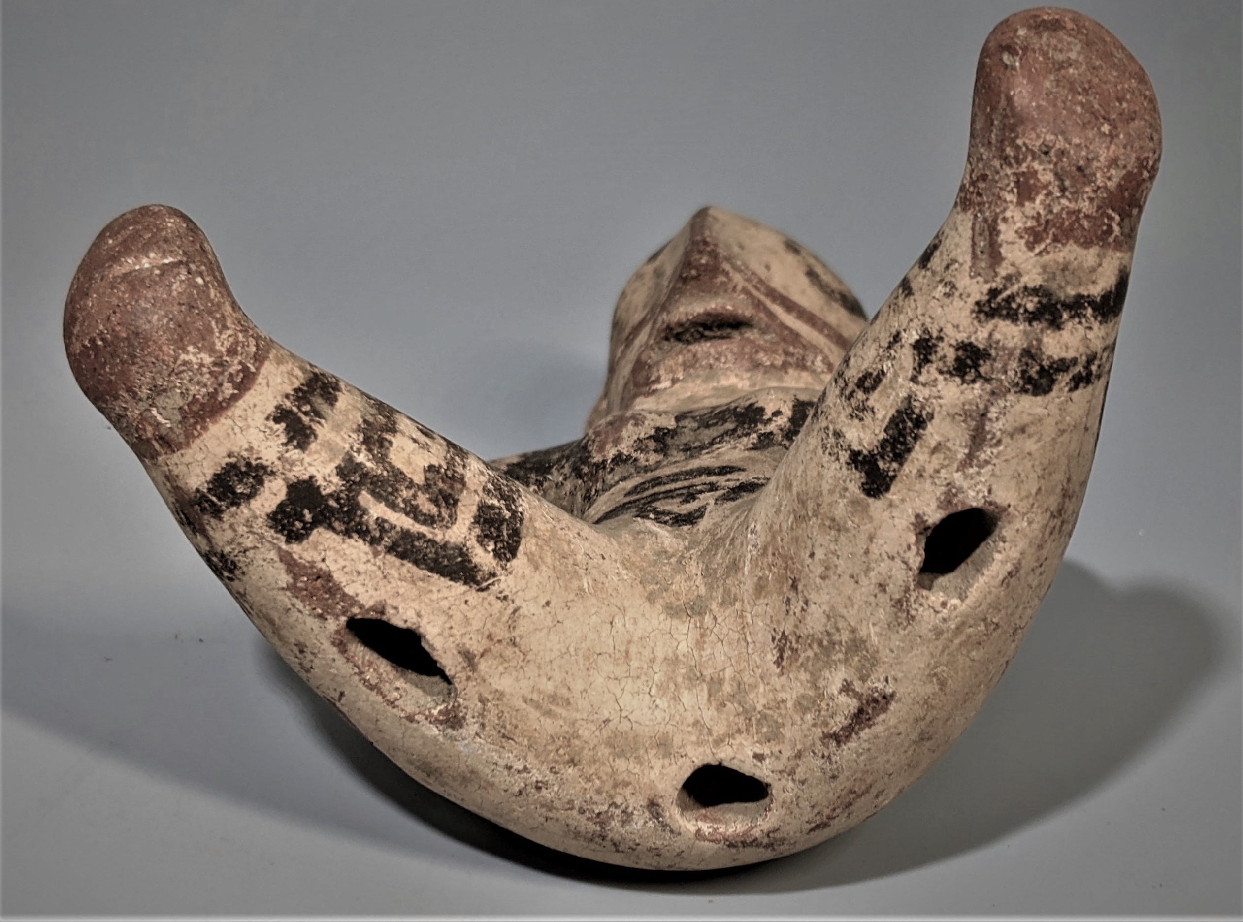 Mayan 500 to 800 AD. The painted and seated male had six musical holes. Nice original and all intact condition, including 90% of its red and brown earth tones over a cream slip. Excellent condition. 5 inches high and 4 across.