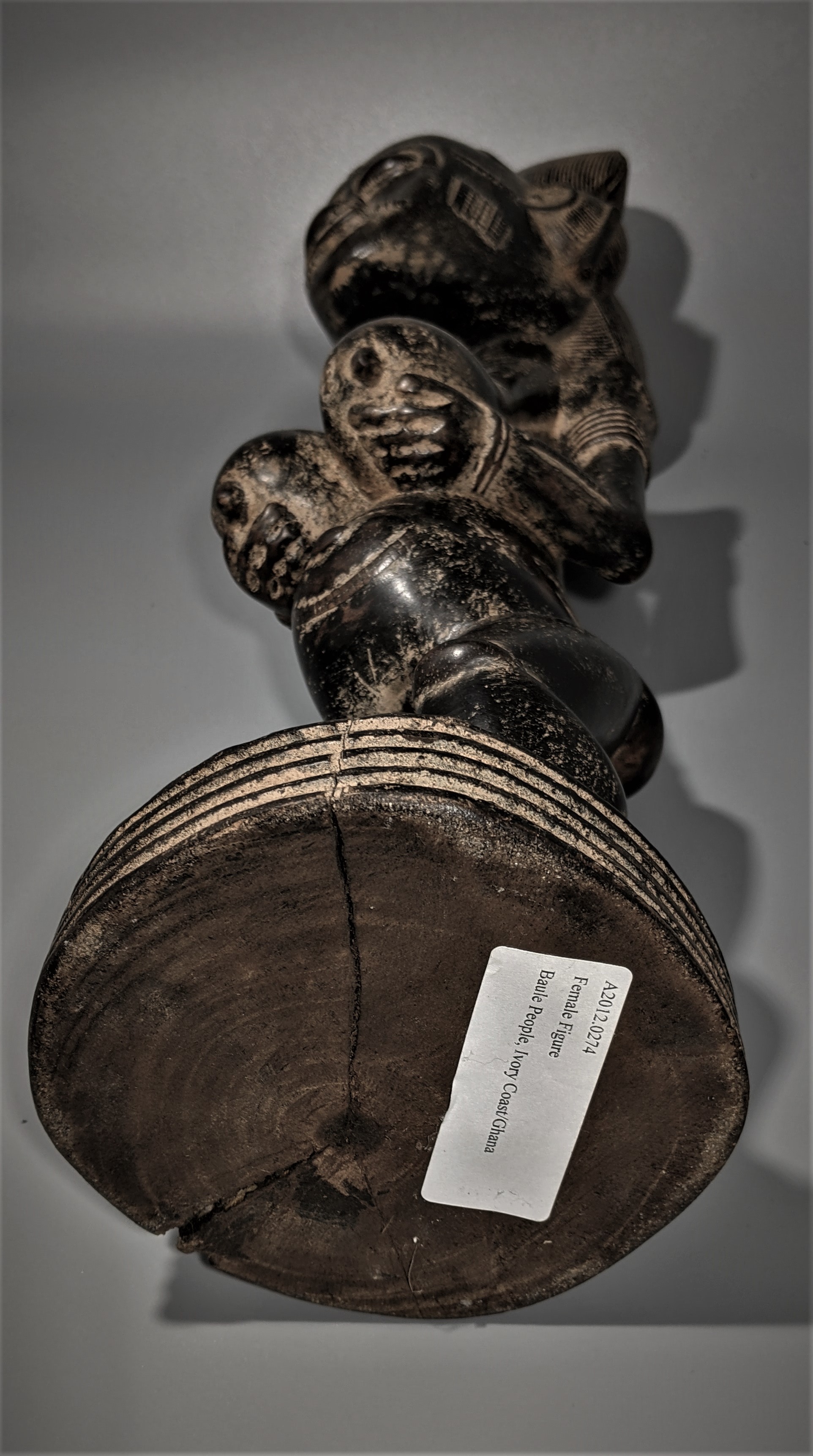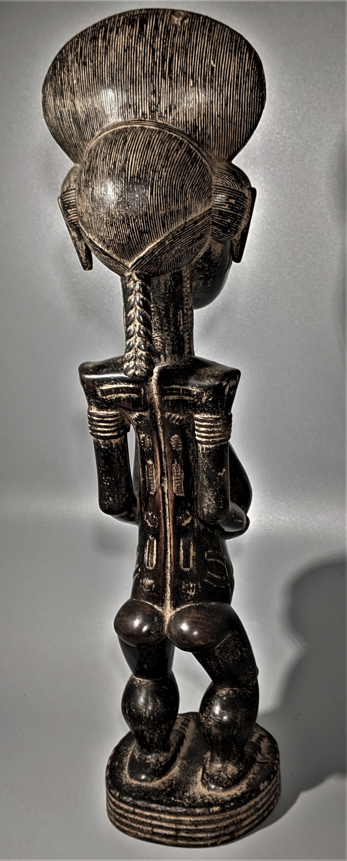 West Africa. Generous size. A particularly fine antique carving. All over crisp carving, dark patina. A crack on left side and through her right ear and head dress. 20" Height