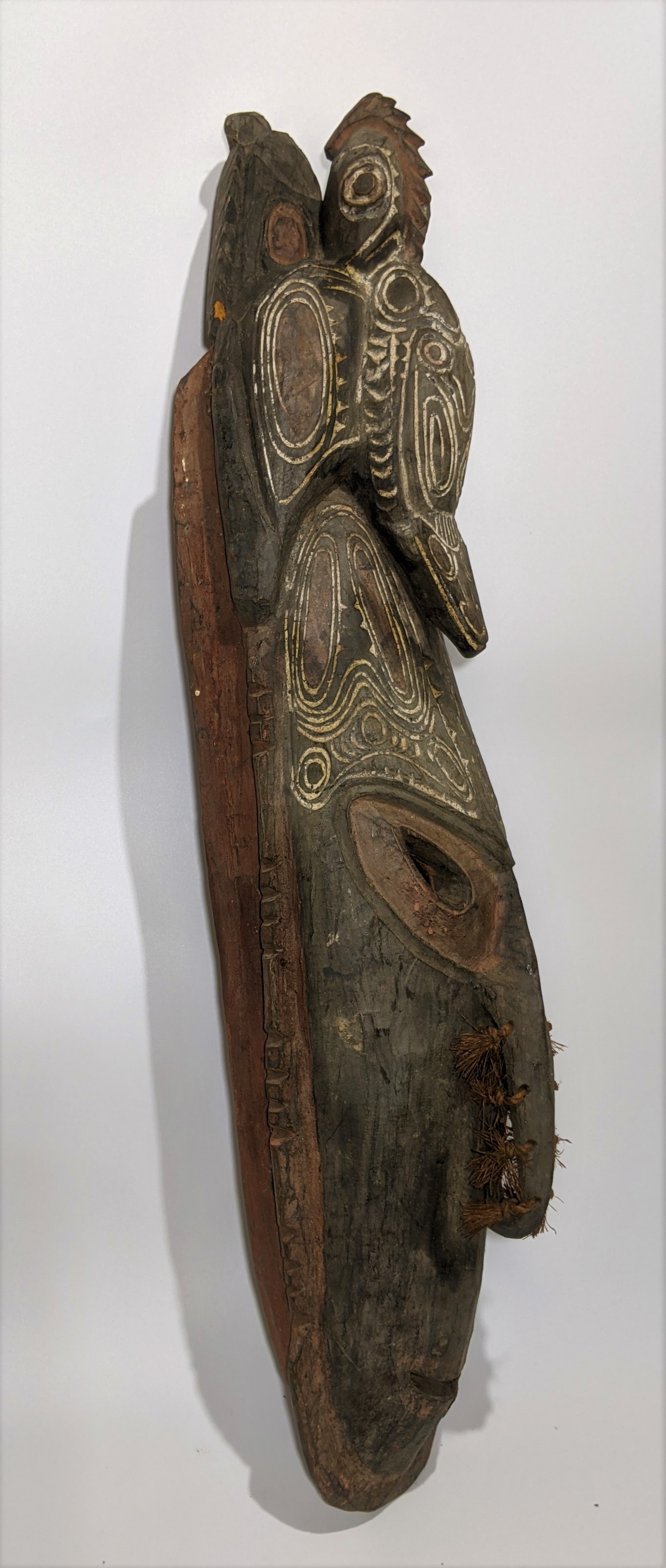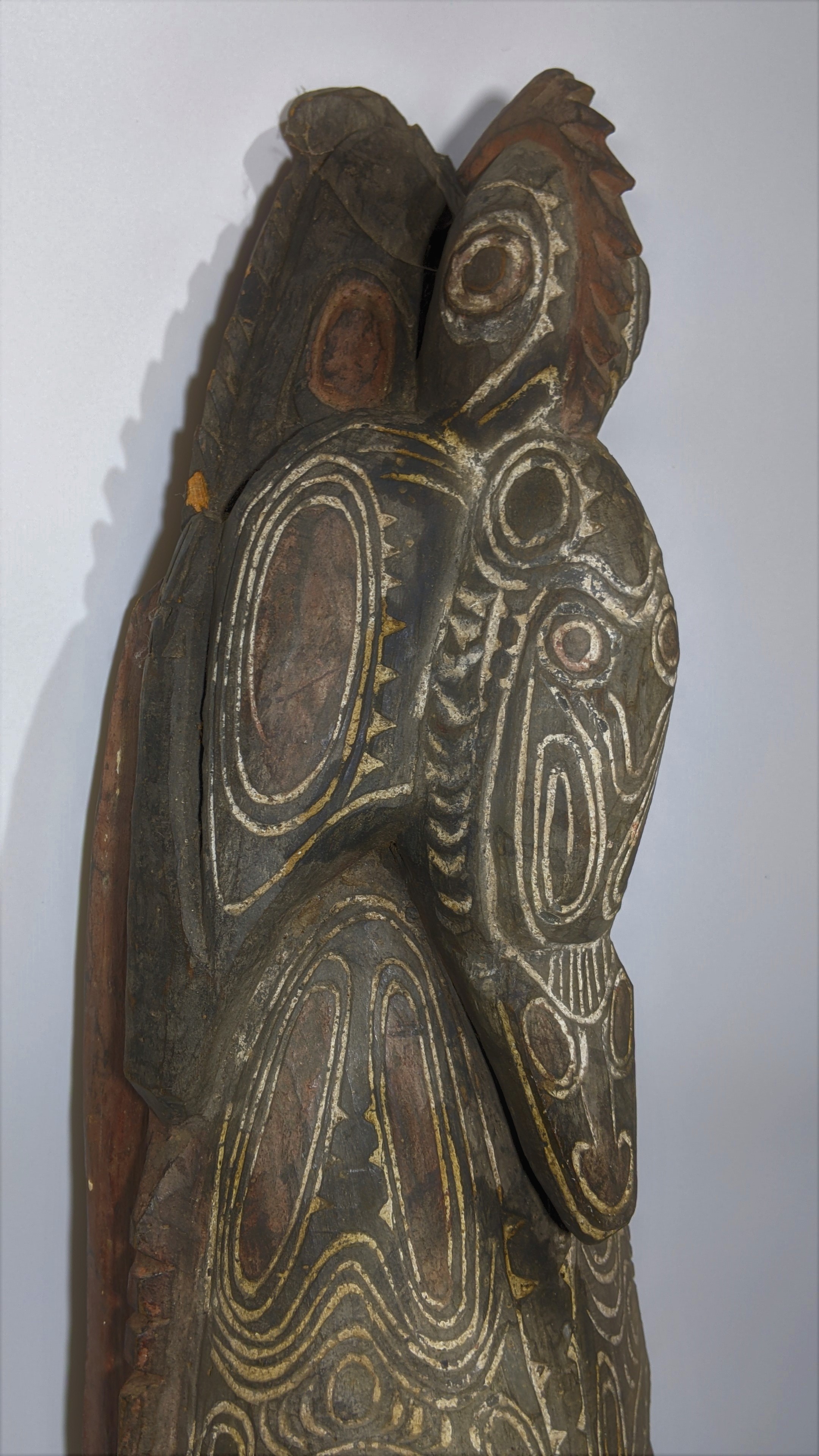 New Guinea, probably Asmat. Original earth colorings, circa 1900. Woven attachments, a pierced nose and bold bird carving, nice untouched condition. 29.5 Height, 8.25 Length across.