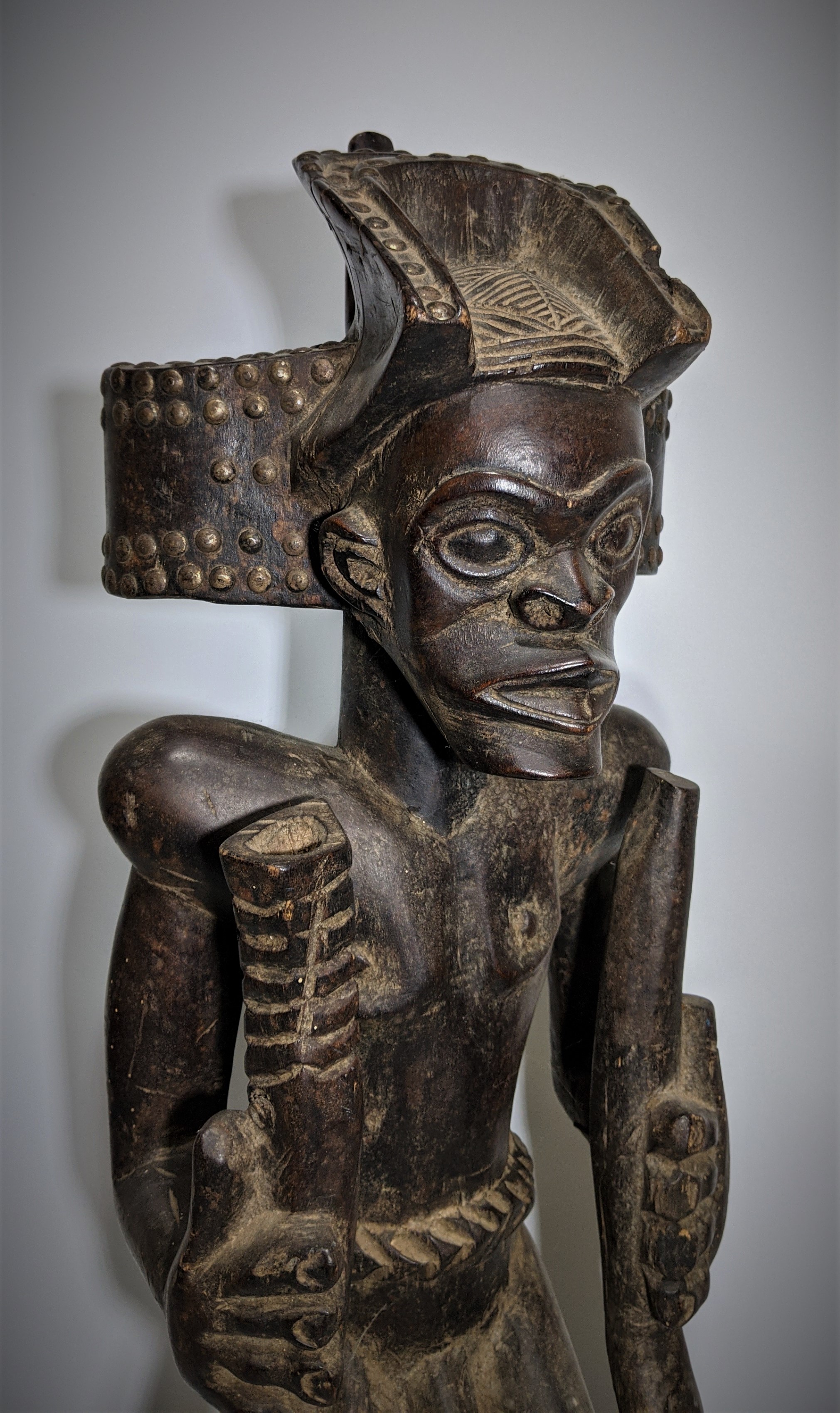 One of the 'pride of the museum', a classical rarity. A generous sized Chokwe warrior figure holding a flintlock long gun and horn in his massive hands. He stands with his high ranking helmet gear. Deep, dark and dense hardwood with a crisply carved face. 27.5" height.