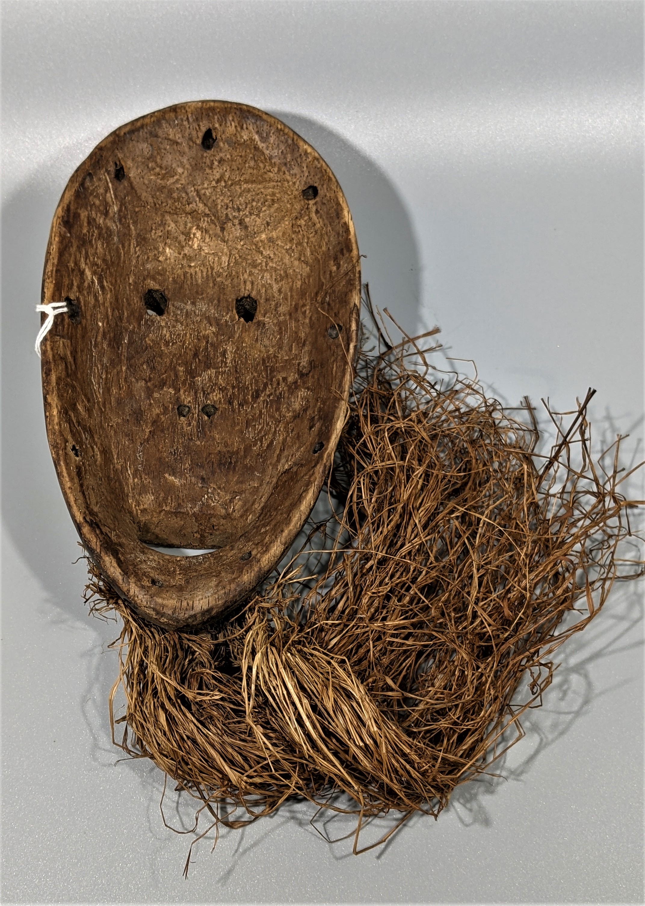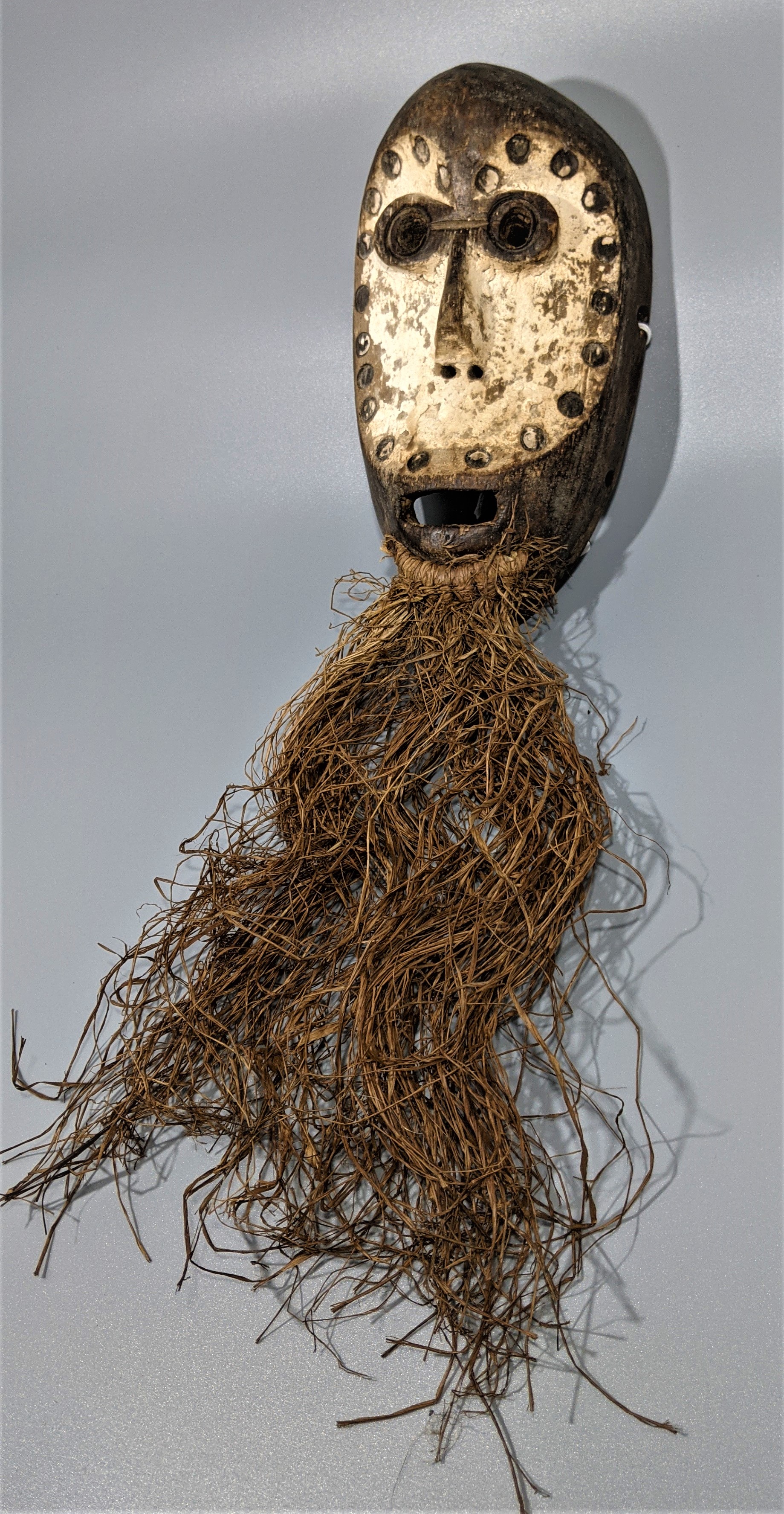 Lega, former ZAire most likely. Small, as a child's or shoulder or belt mask type with much remaining of its white kaolin, it holds its attached grass woven raffia. Good age. 8" Height.