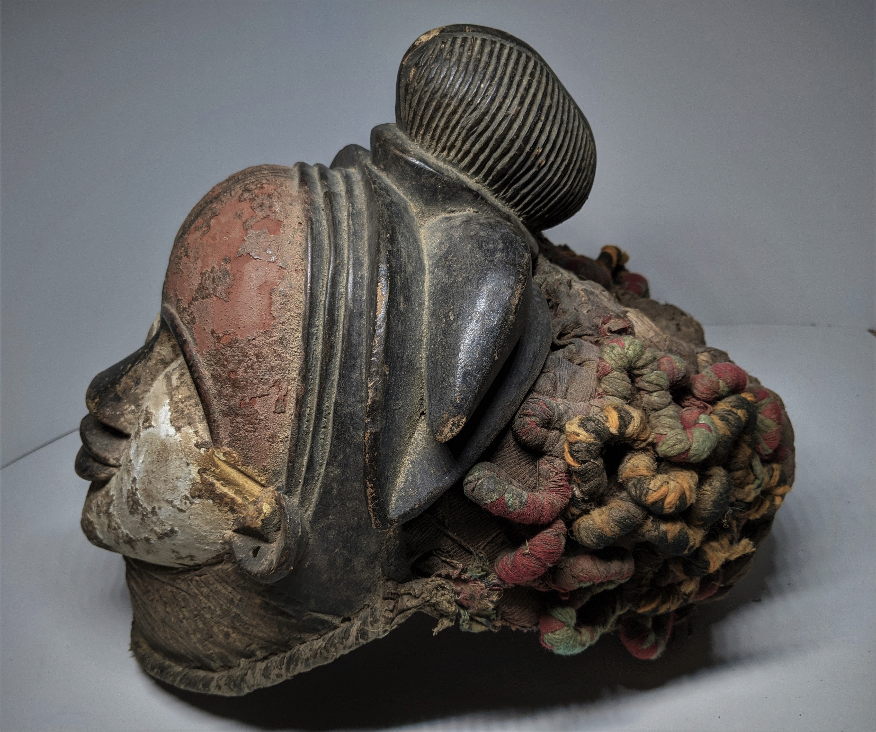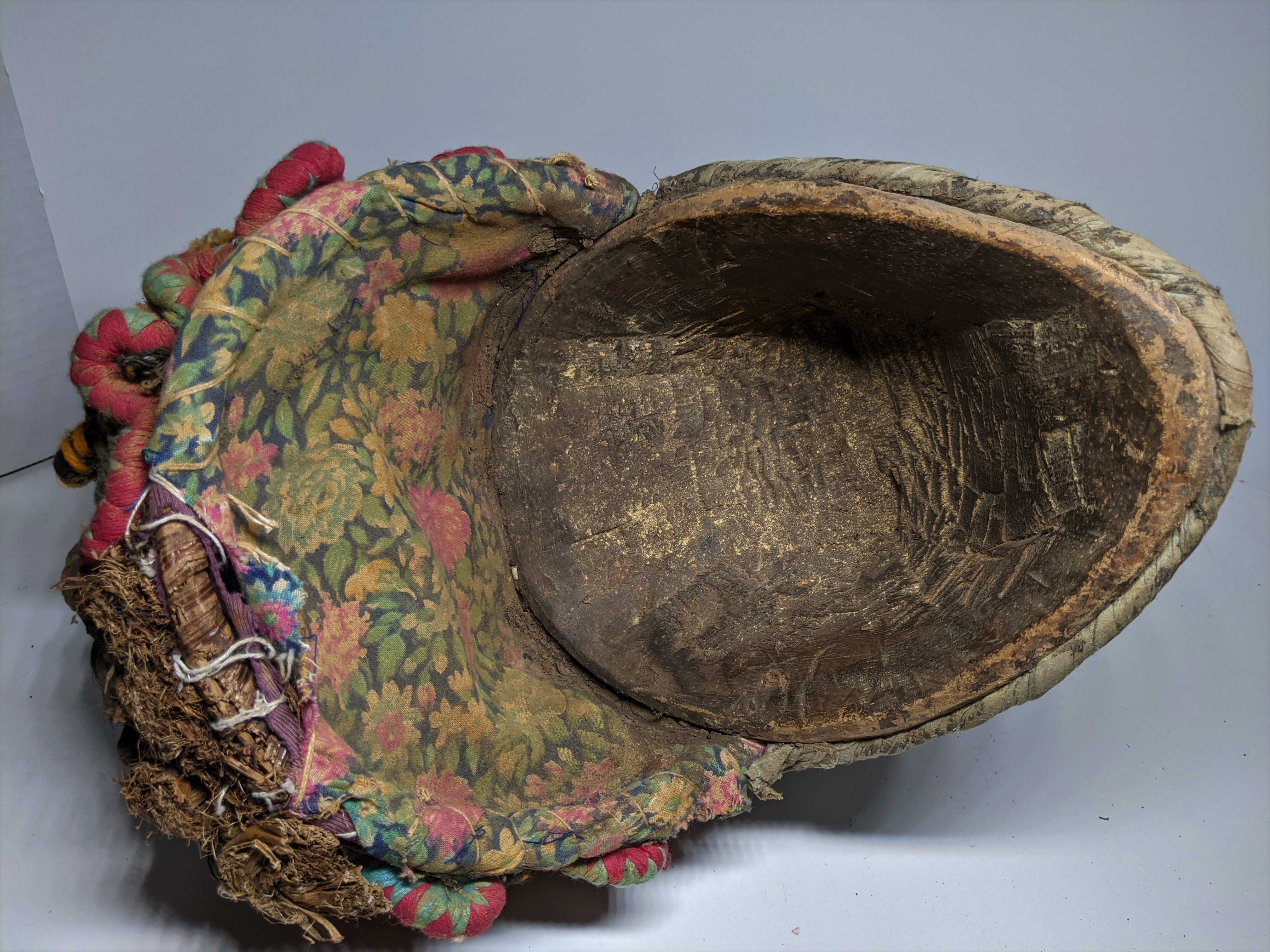 A good old one with original earth tone coloring. The helmet super structure of woven basket work carved in worm like fabric coils, appears original to its conception (1880-1920). 12" Height.