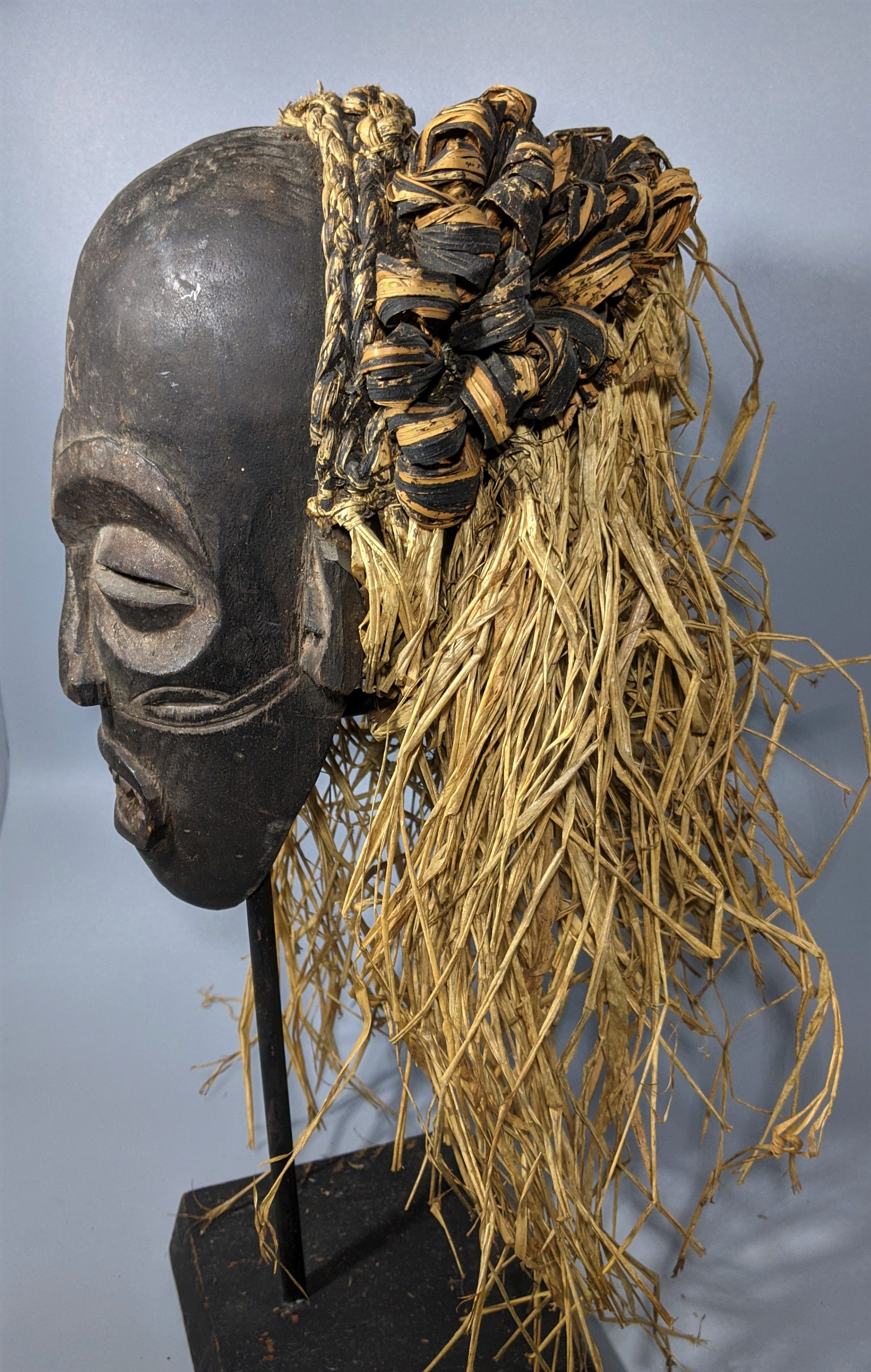 A classical tribal carving with strong age and likely more modern fiber work attachments. Dry natural and original surface. 11" Height.