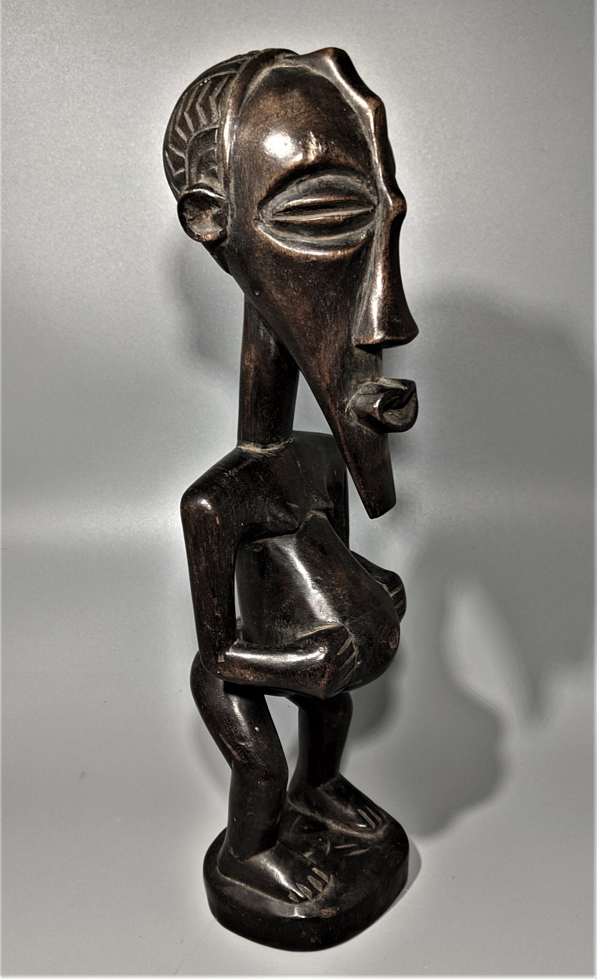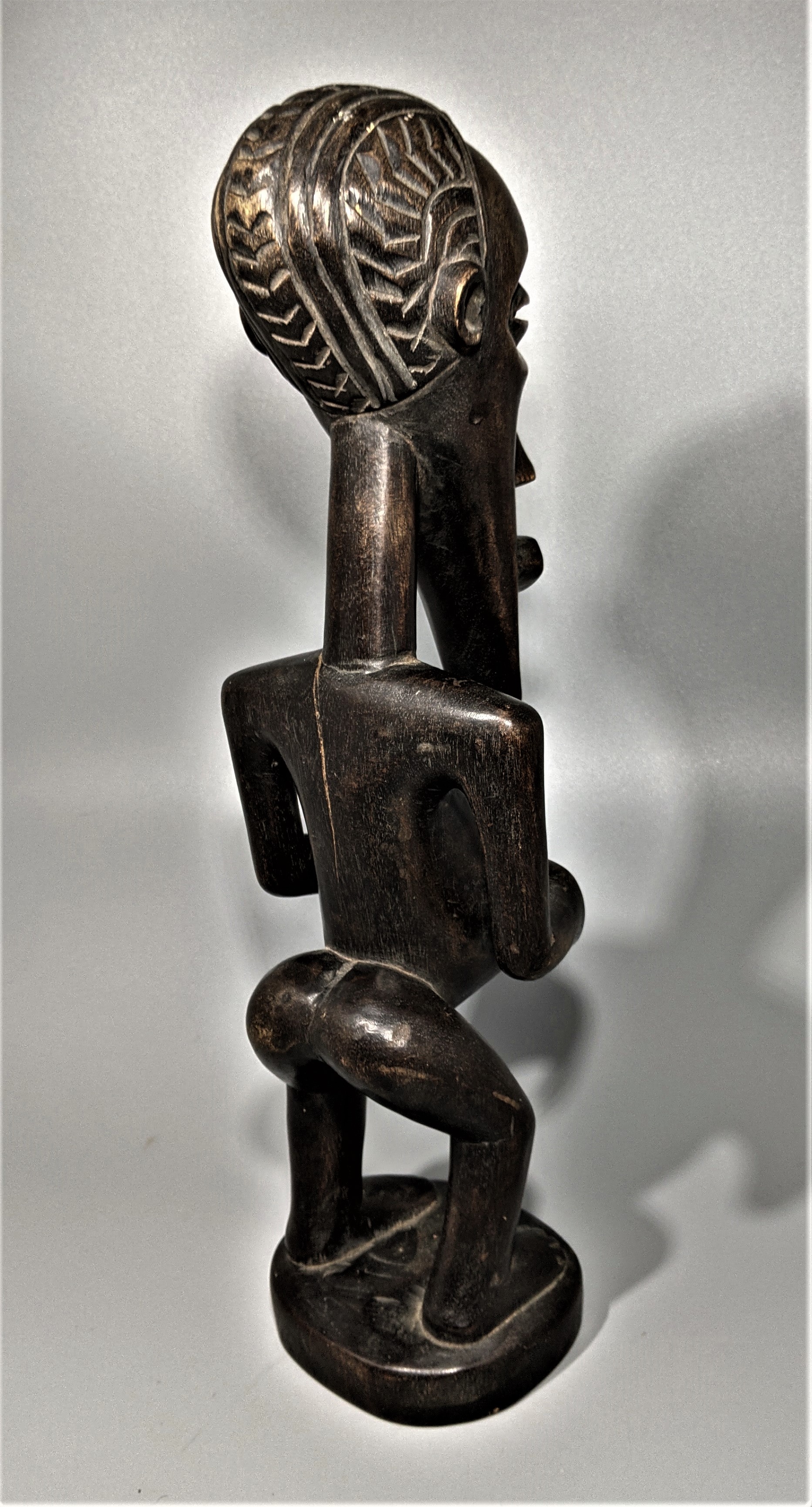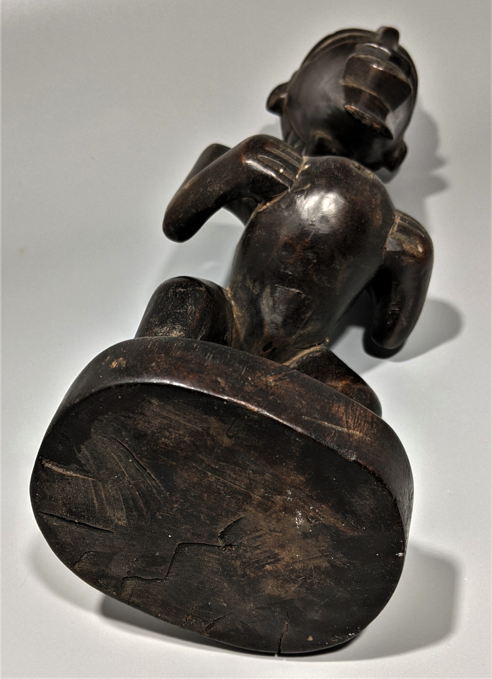 Older 20th century. We believe this piece is probably tribal. Well-carved, elongated head, from a hard wood of medium density. A tight stress crack at central back. 16" height. Ex. Willie Postar collection, Massachusetts.