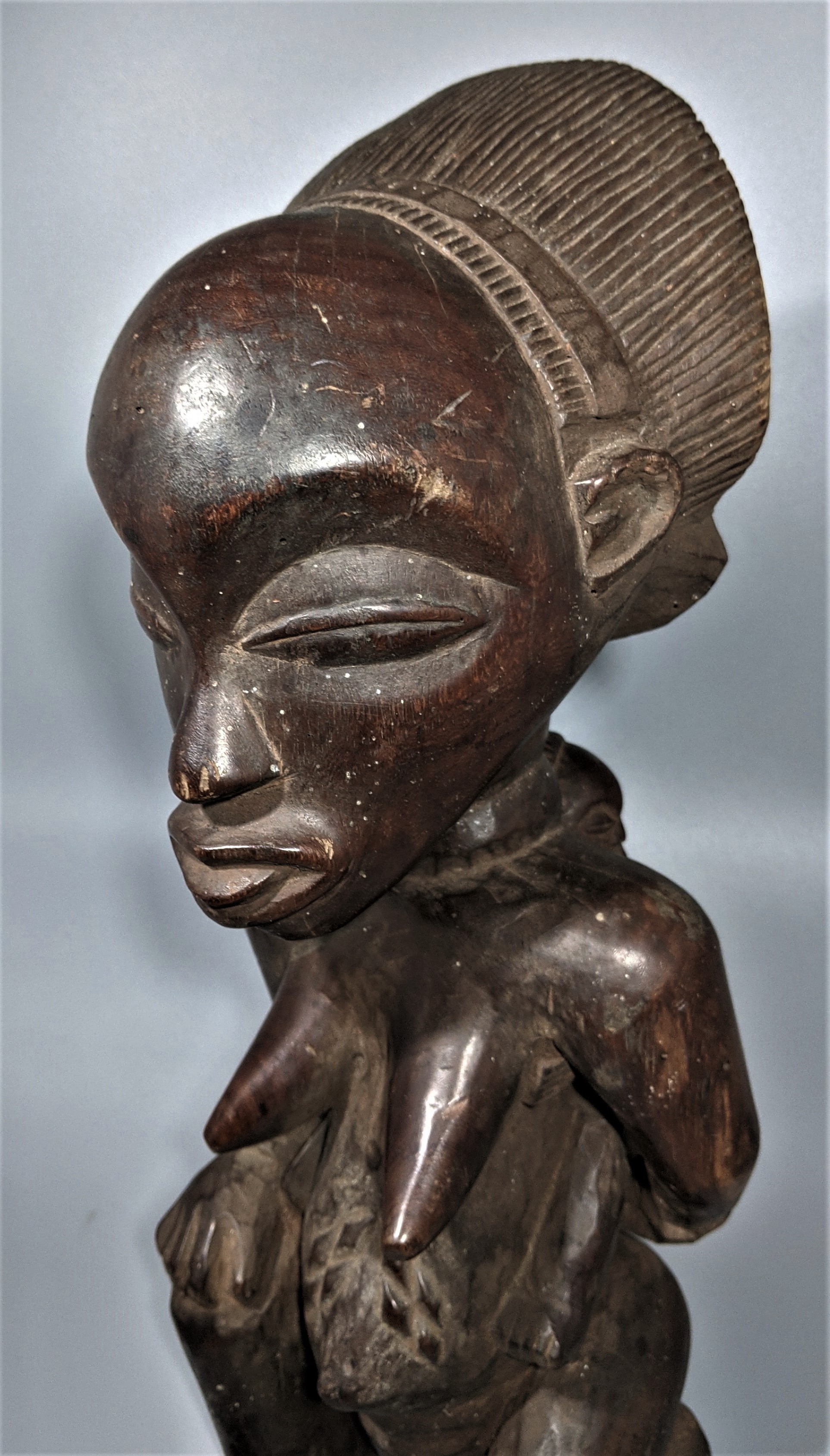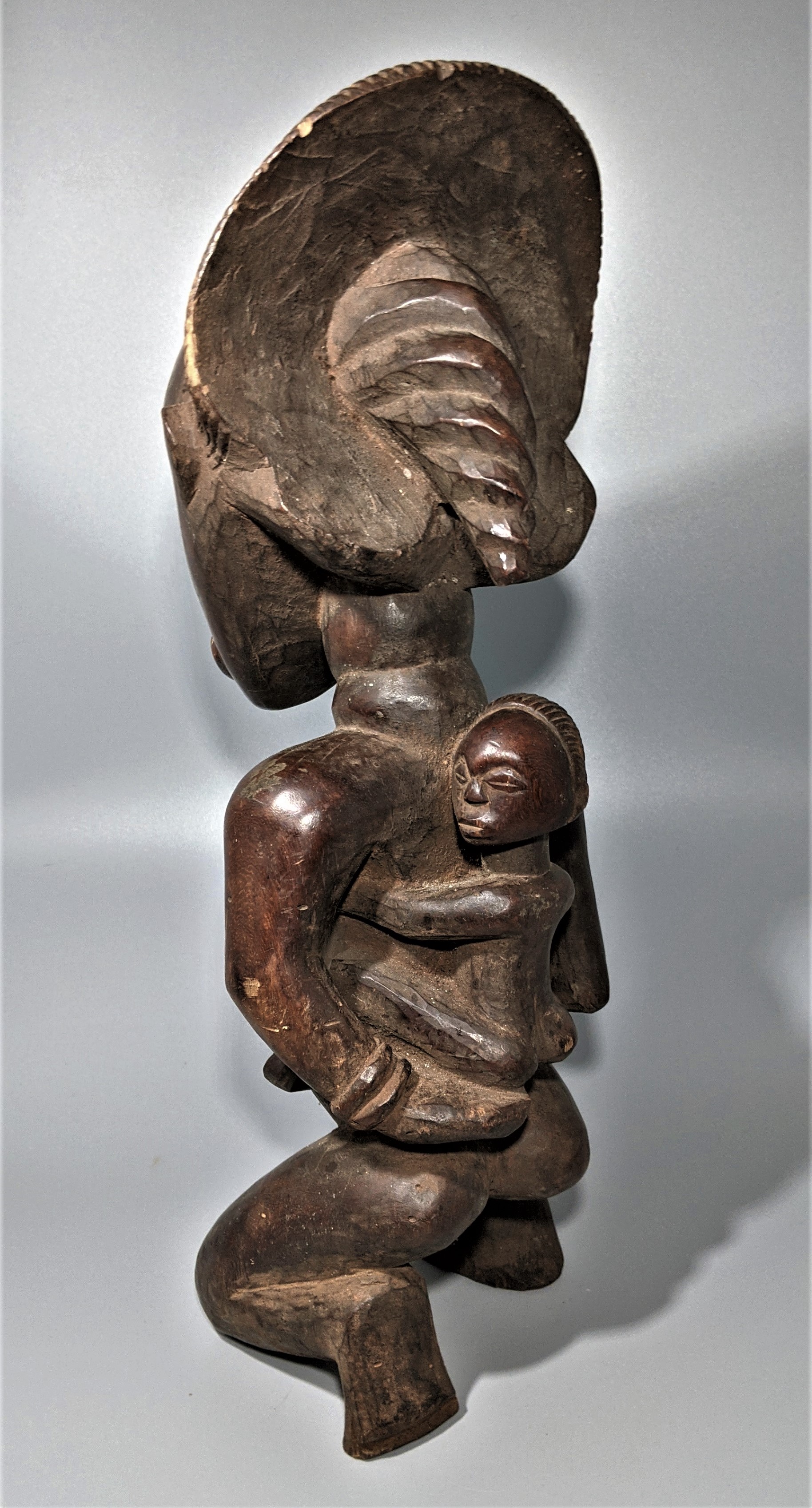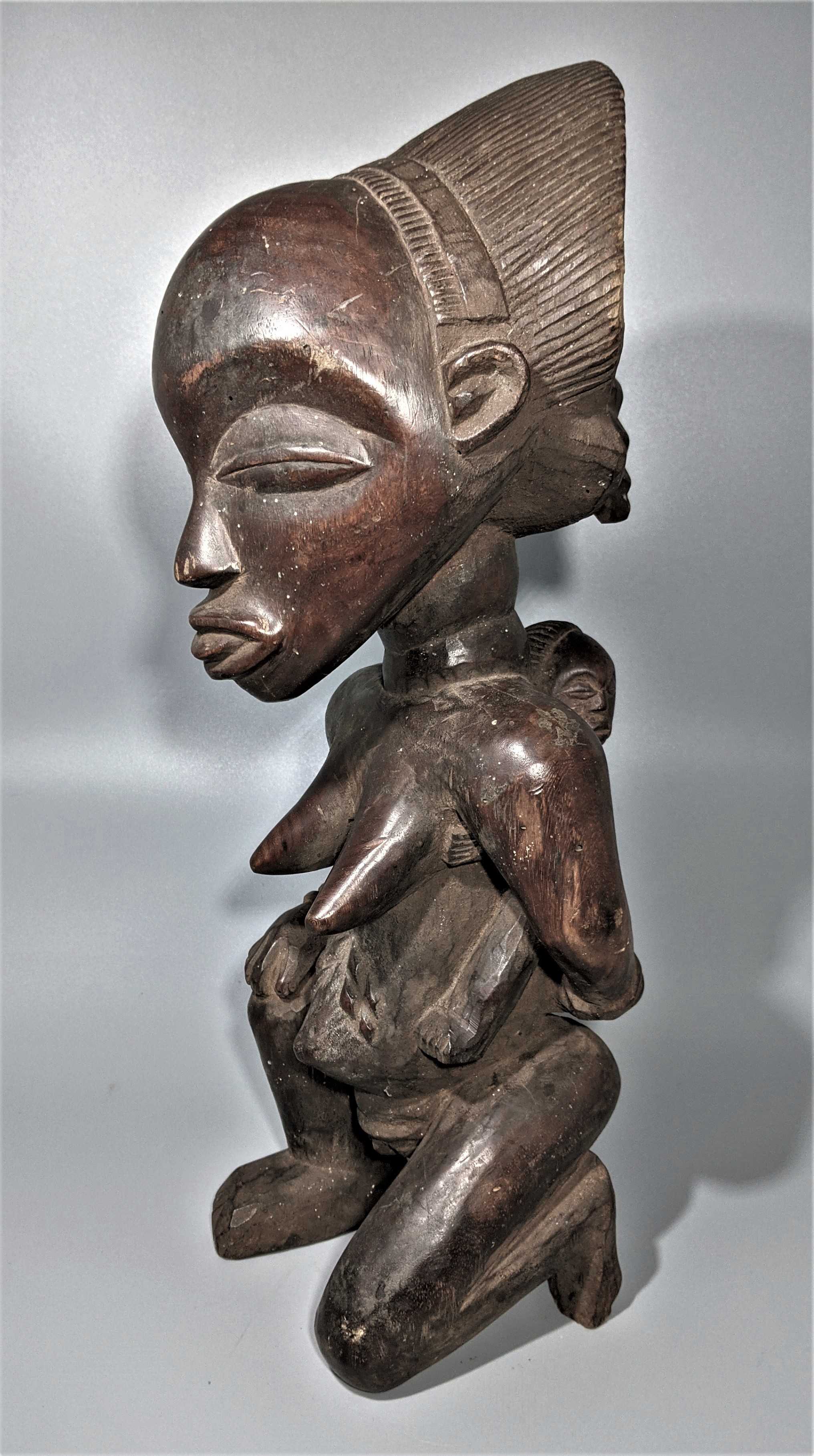With true age, a particularly strong Luba fertility figure, kneeling and reaching back to support her young child. A sophisticated Congolese carving with original polish and crisp details. The dense and hard wood is very heavy, her coiffure regal size, one of very best of her type. Ex. Mass Musem. In fine condition. 18" Height.