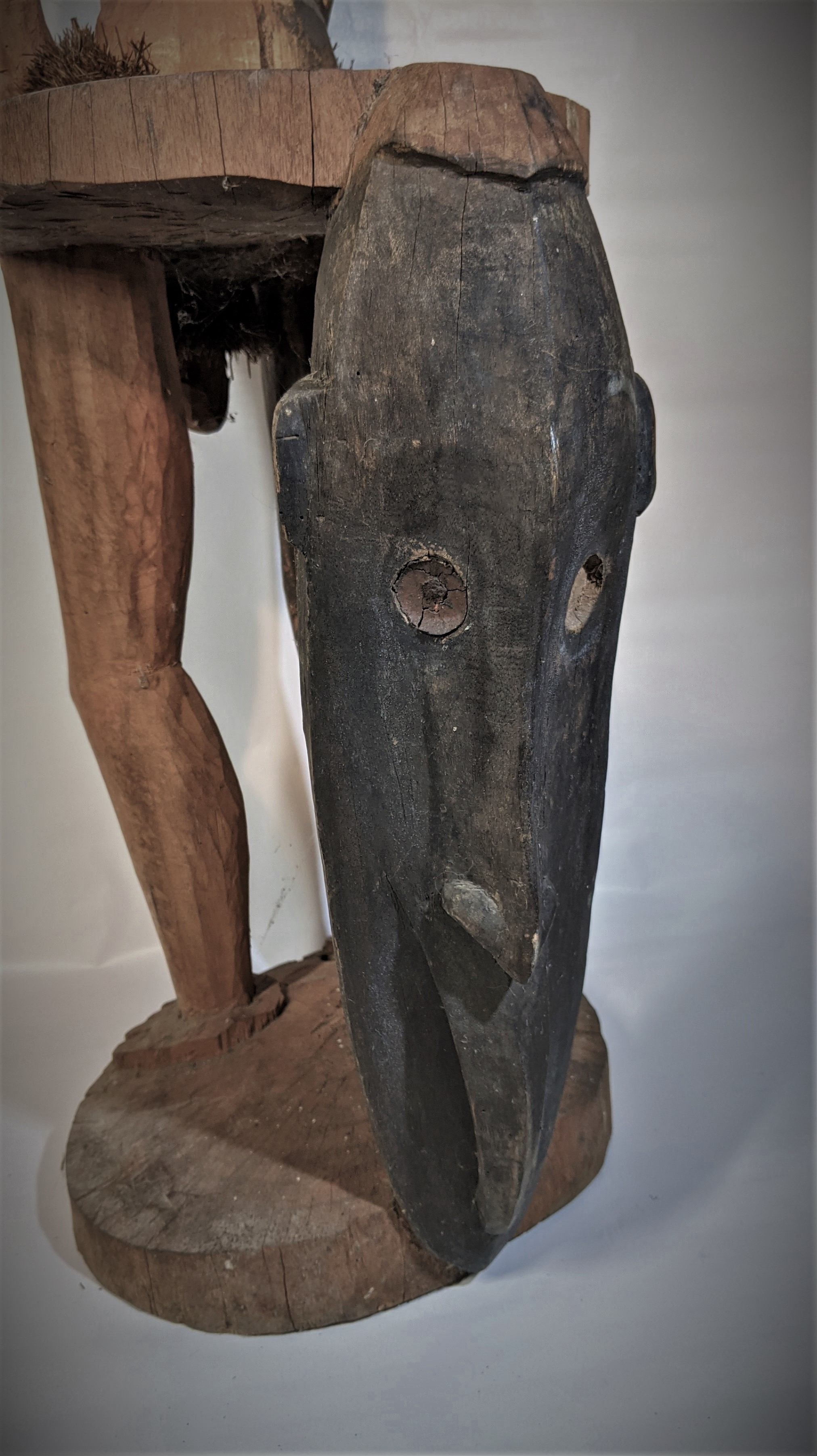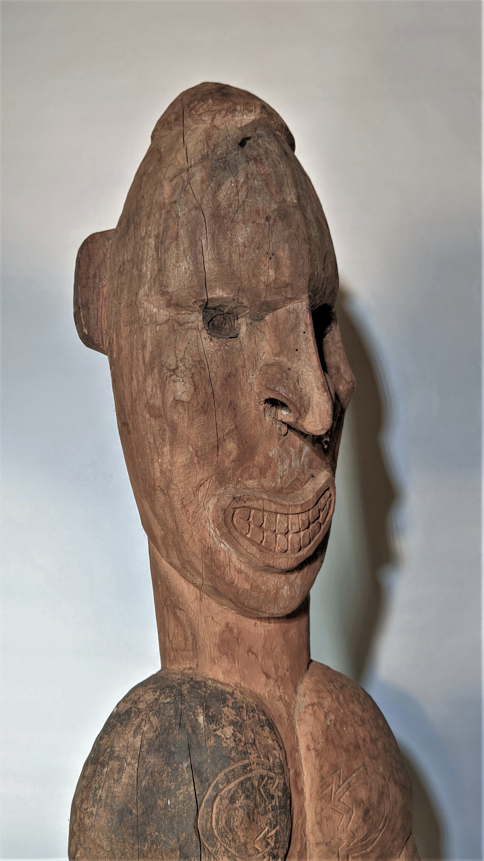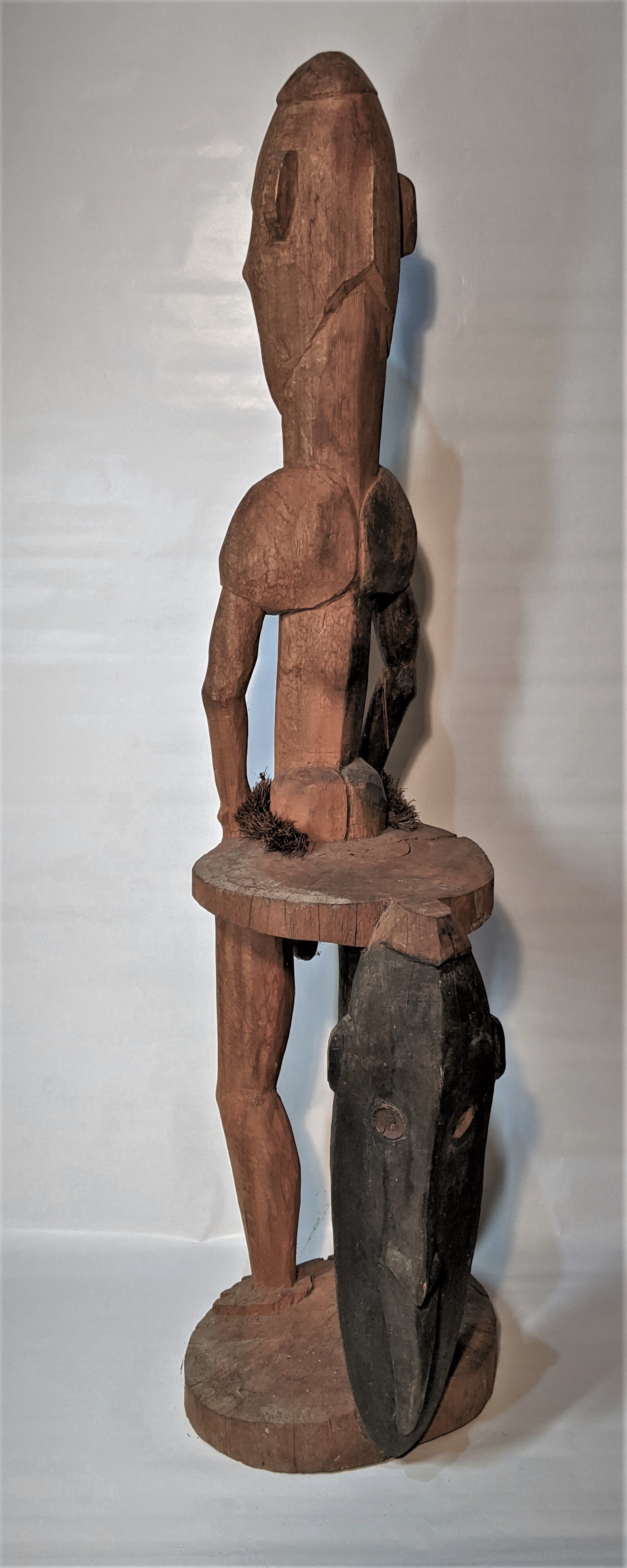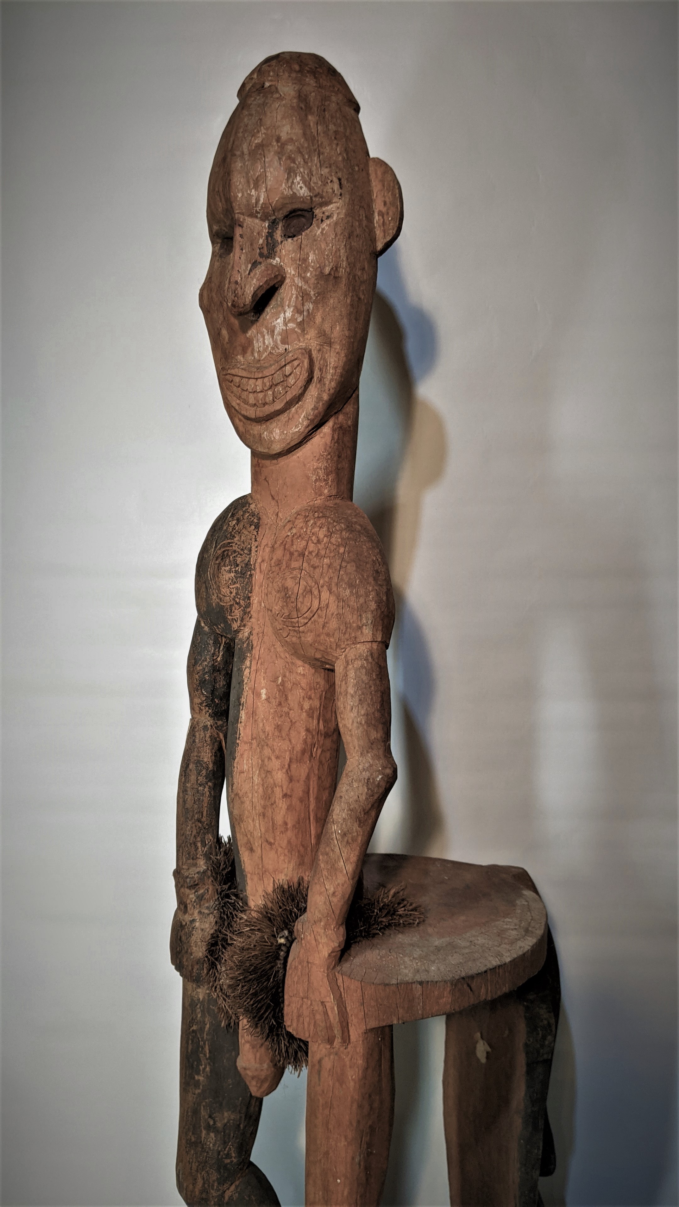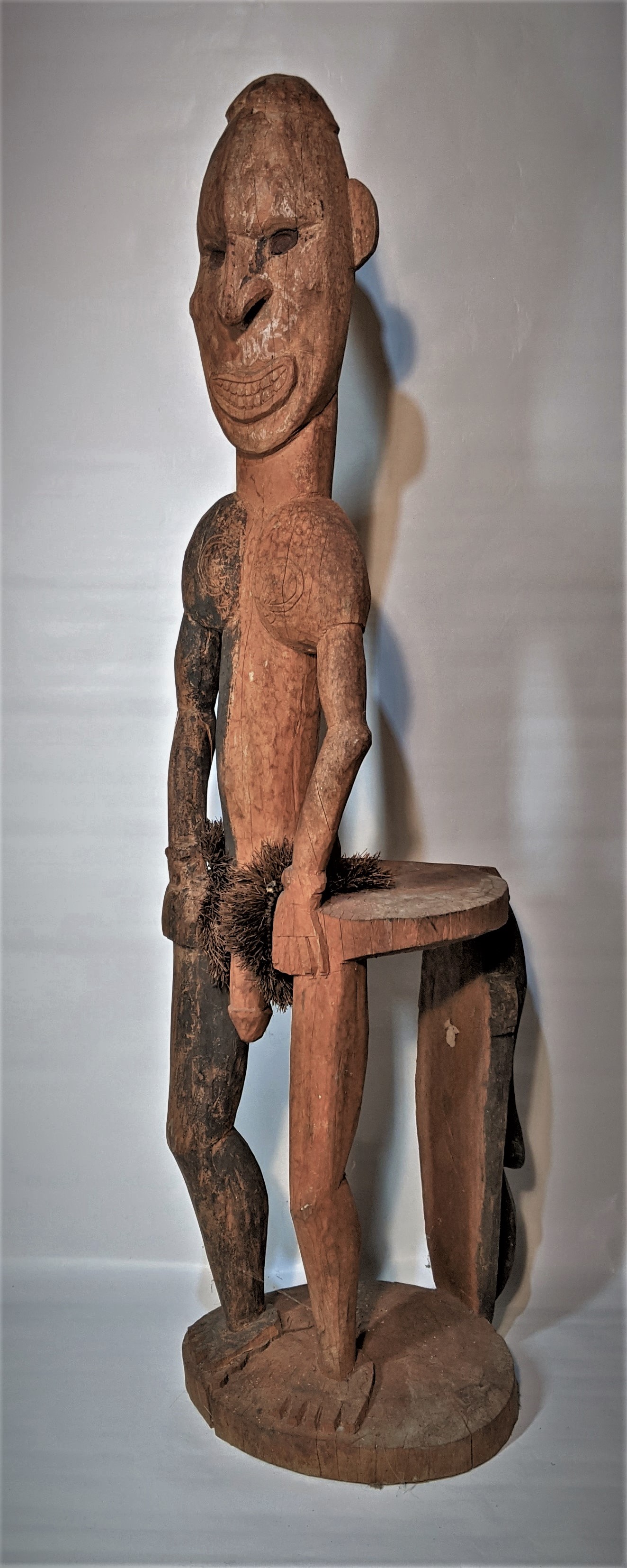 Rare and unusual New Guinea Figural Carved Offering Stand. Impressive 37" tall. a male of obvious gender with black and red earth paints and original fiber work attached.