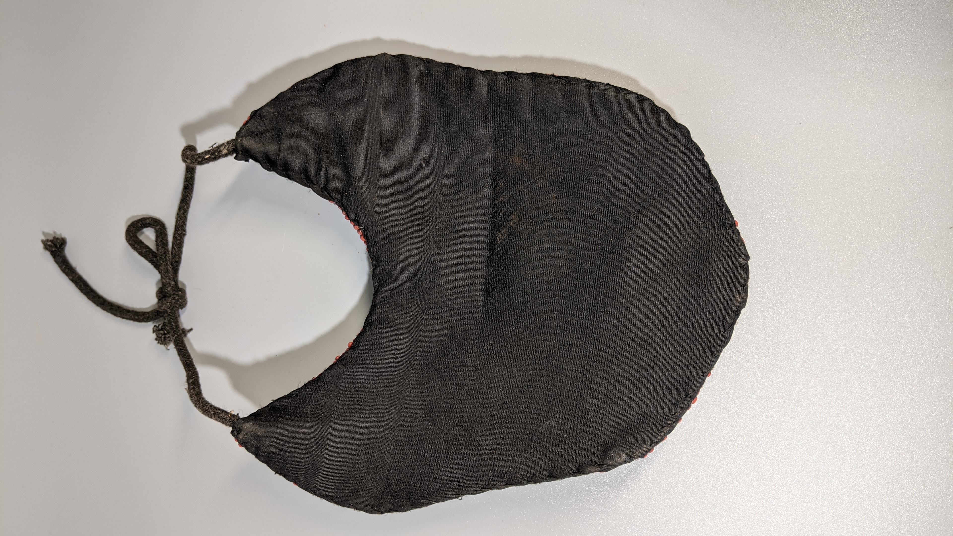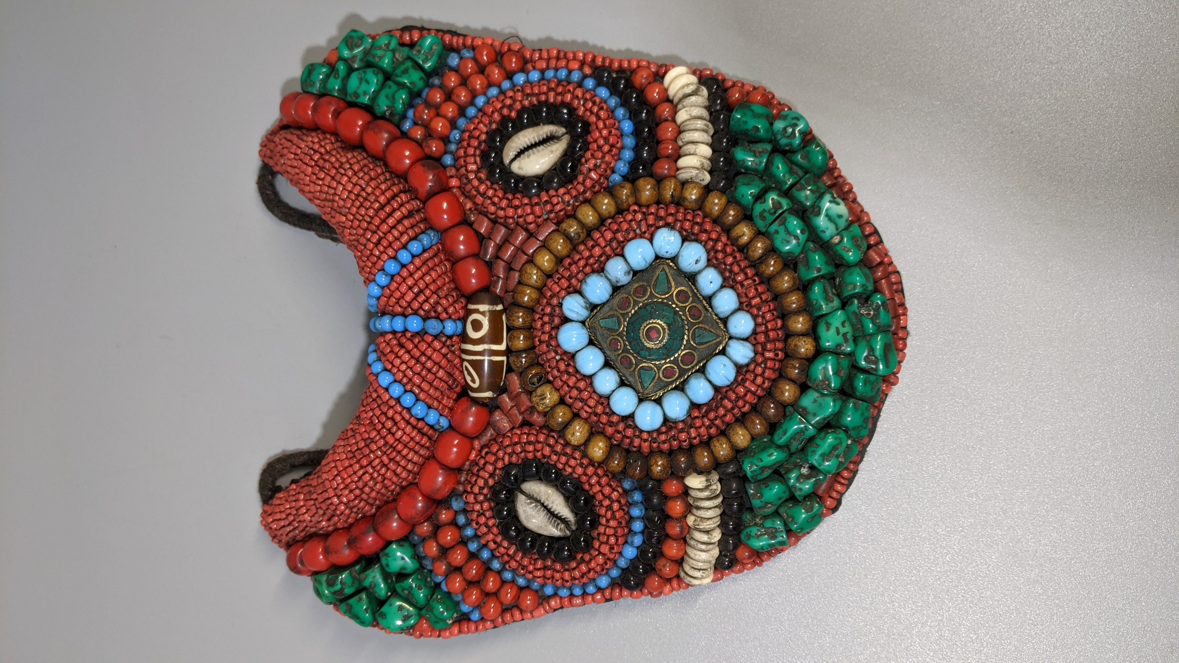 A symbol of rank a multi crafted and beaded mask form, with enamel work central boss. On a heavy leatherwork frame. Mostly natural beads of turquoise and coral. 20th century rare. 8 inches at its widest point and 9 inches tall.