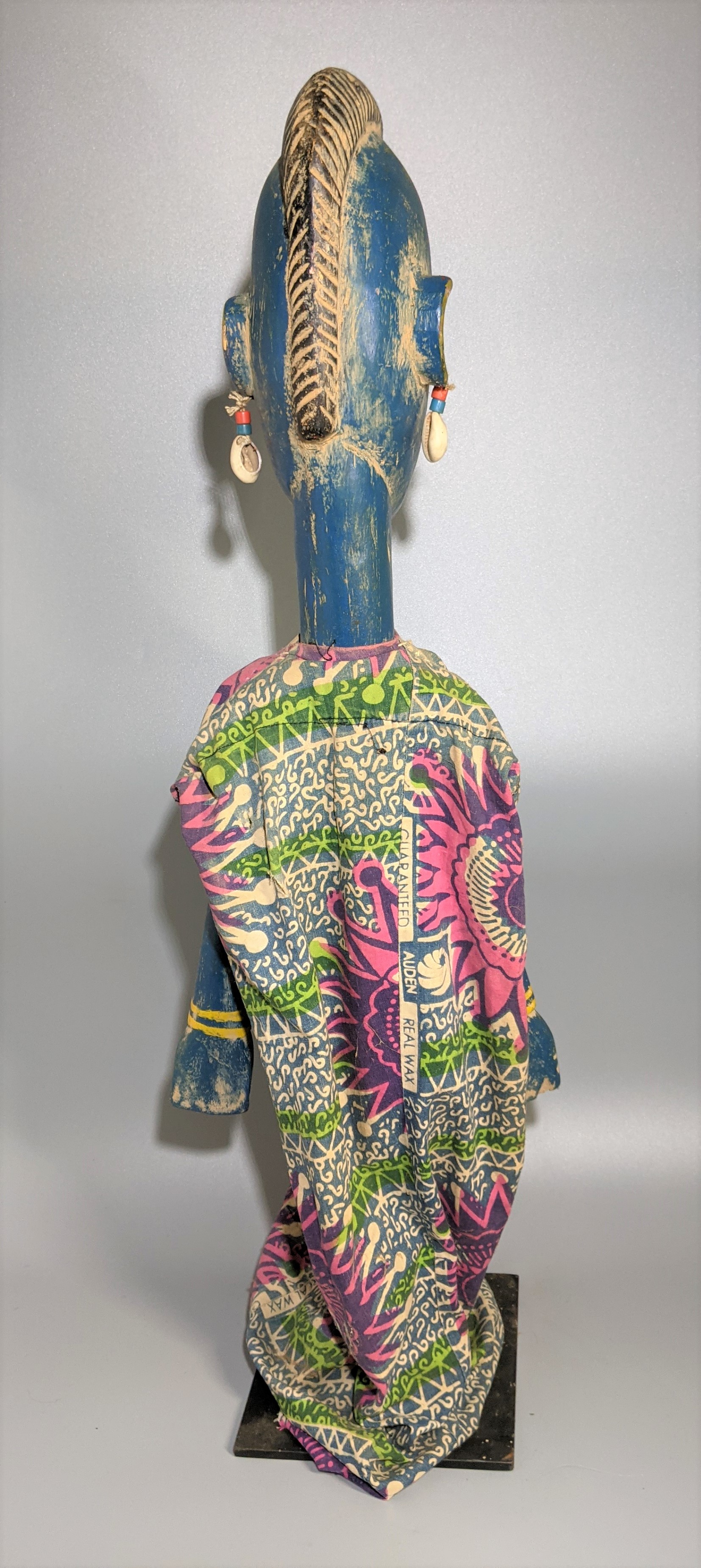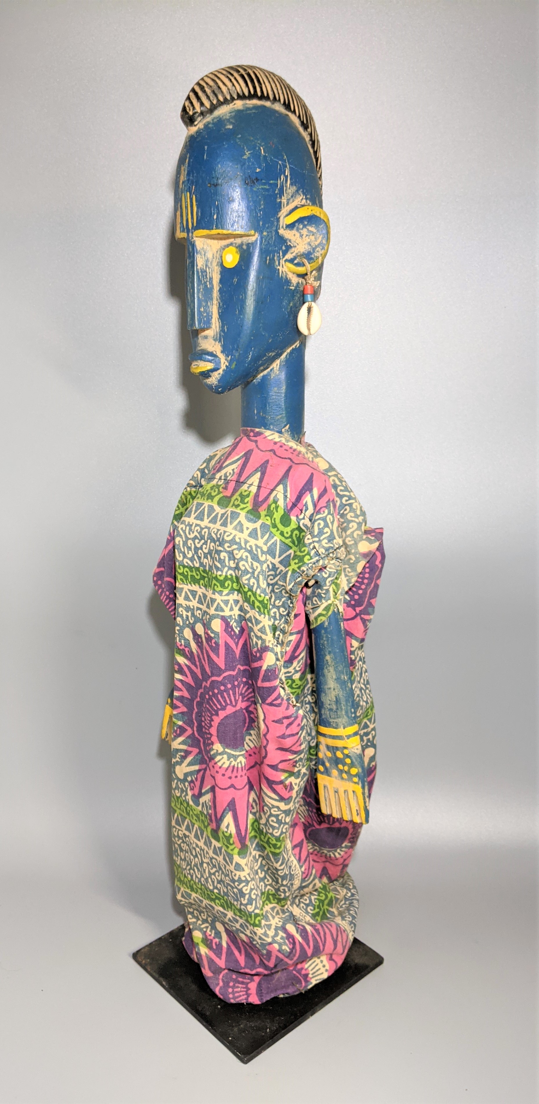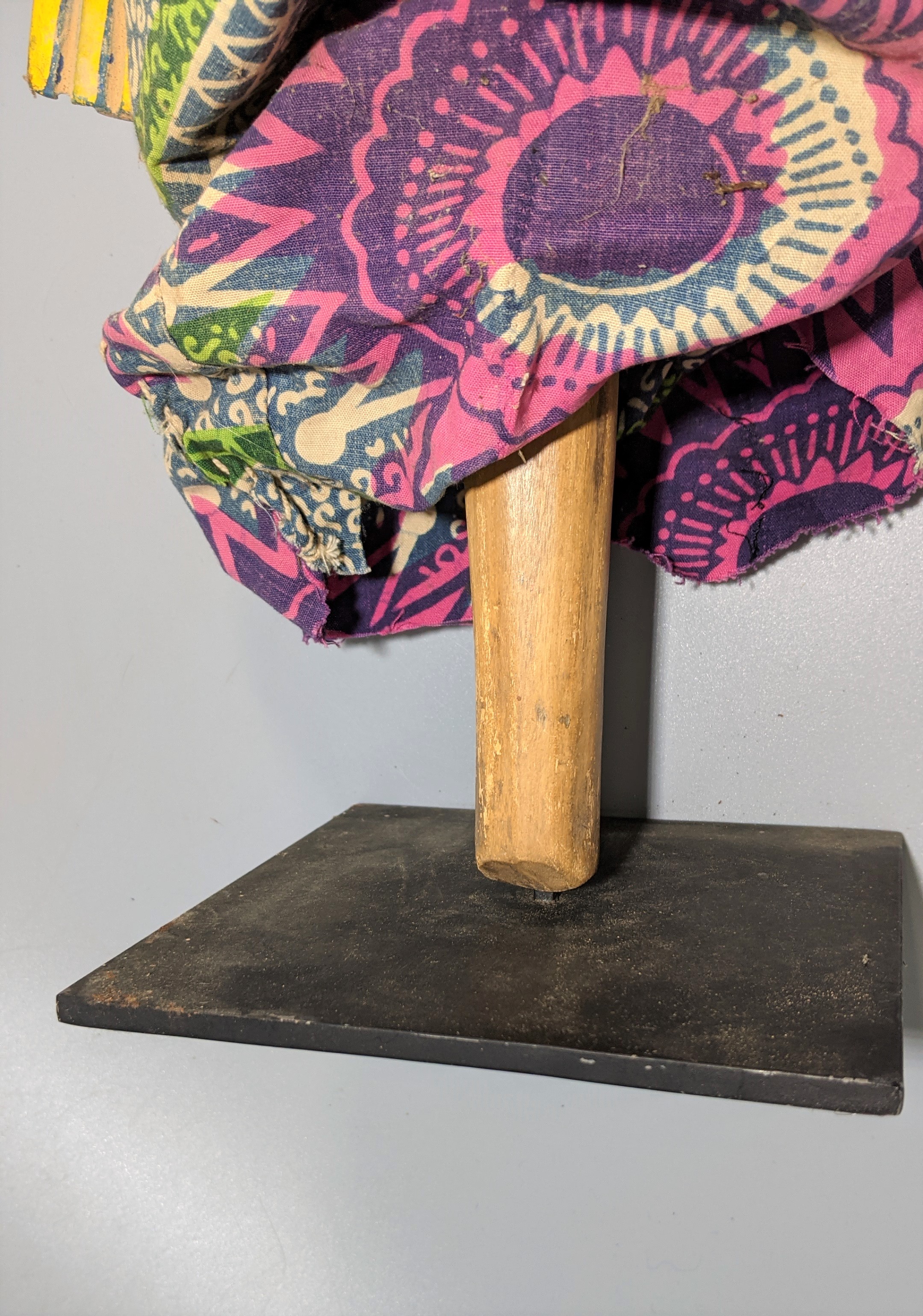 1st part 20th century. Old tribally used custom iron stand. The breasts also with blue surface under the fabric. Ex: Rosen Collection. As appears in The Colorful Sogodo Puppets of Mali. The exceptional book by Marry Sue and Paul Peter Rosen. This puppet has an exabihtion history in Philadelphia. The puppet alone is 26 inches but sits higher on a stand. Exceptional condition.