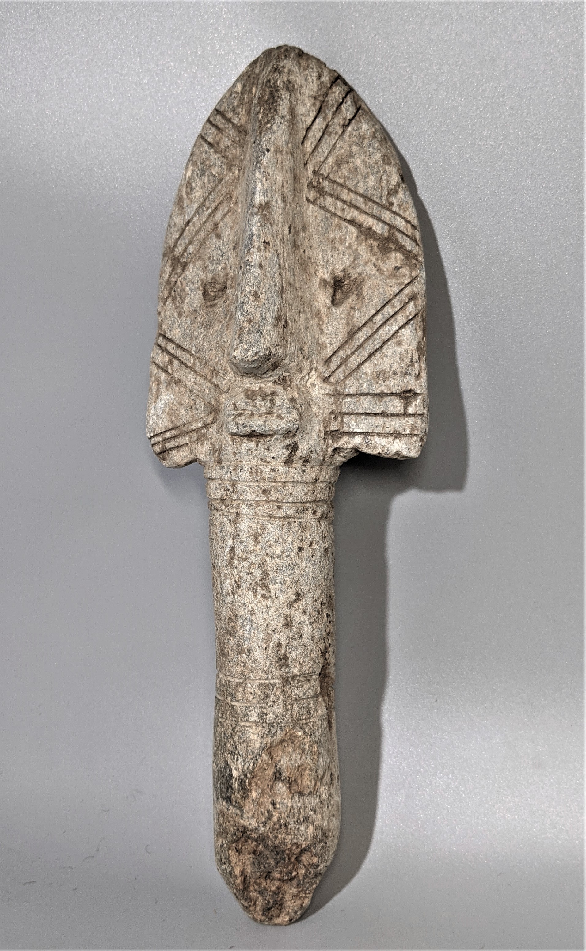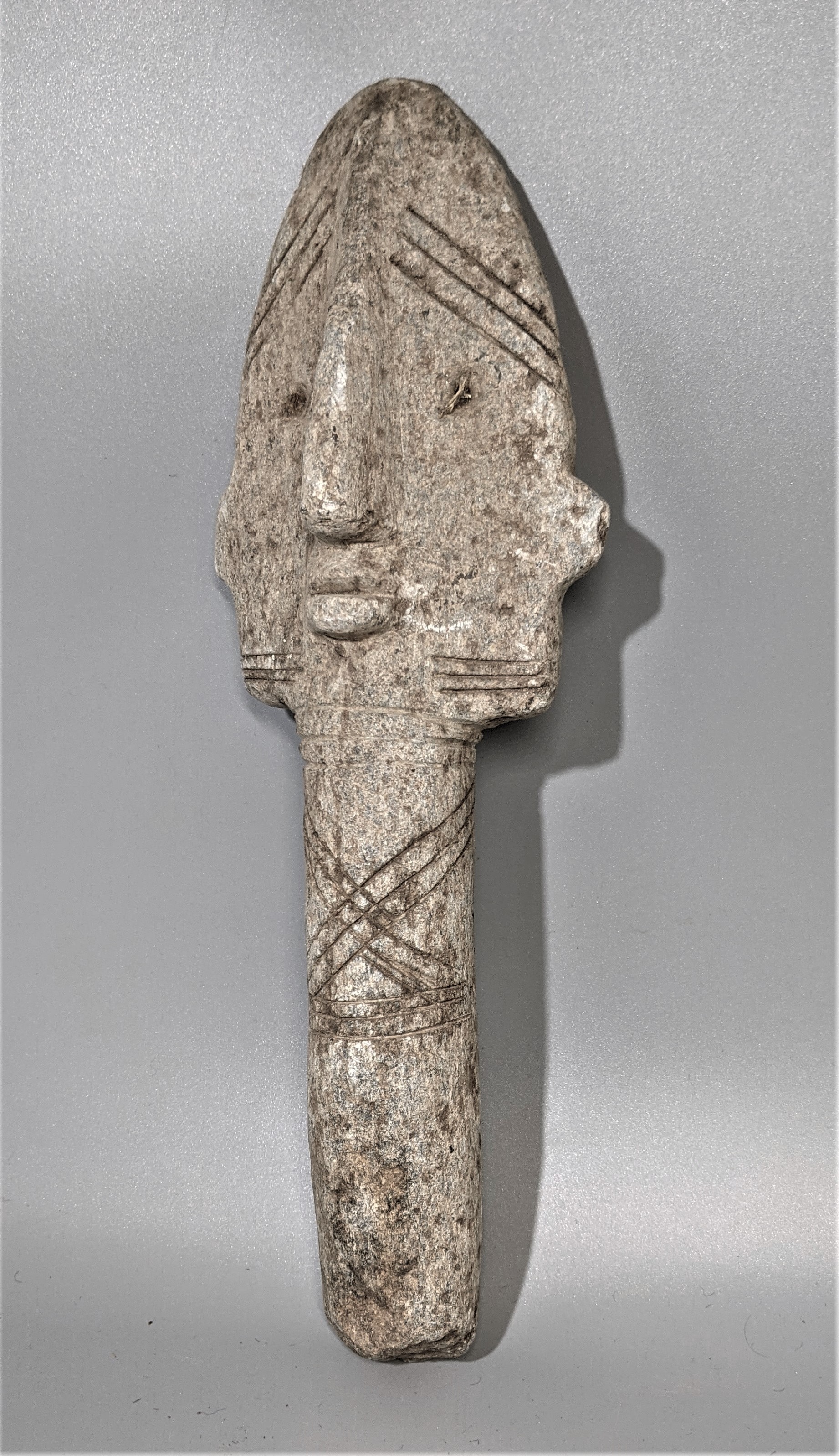 From present day Niger and Burkina Faso. These carved gray of bluish shist stone are of the Bura-Asinda- Sikka group and date from the 11th the 14th century AD. Funerary idols very rare as a pair, apparently male and female. They were eventually buried over as grave markers. The graves under were found to contain both anthropomorphic and zoomorphic terracotta figures stone idols iron weapons and bronze jewelry. 13 1/2 inches high. Fine condition.