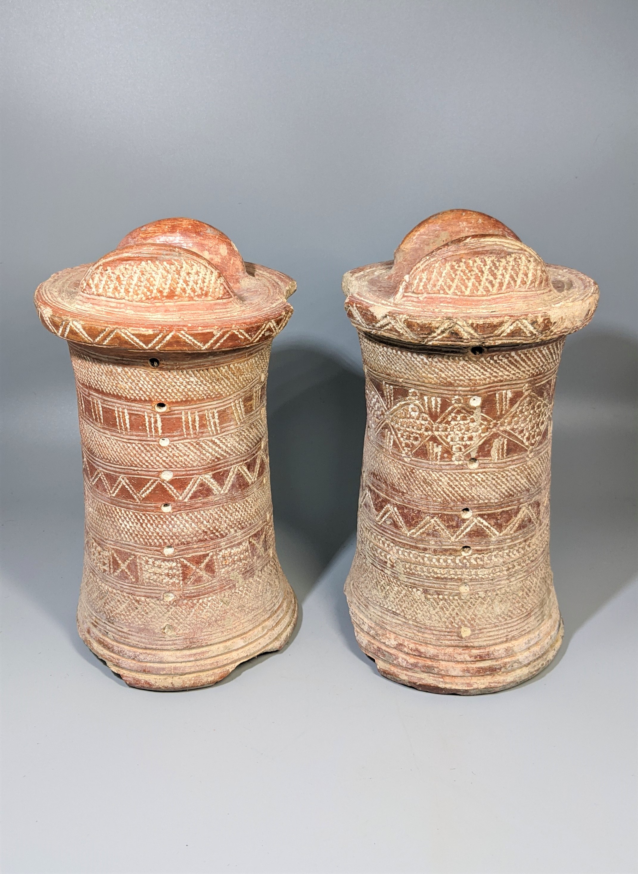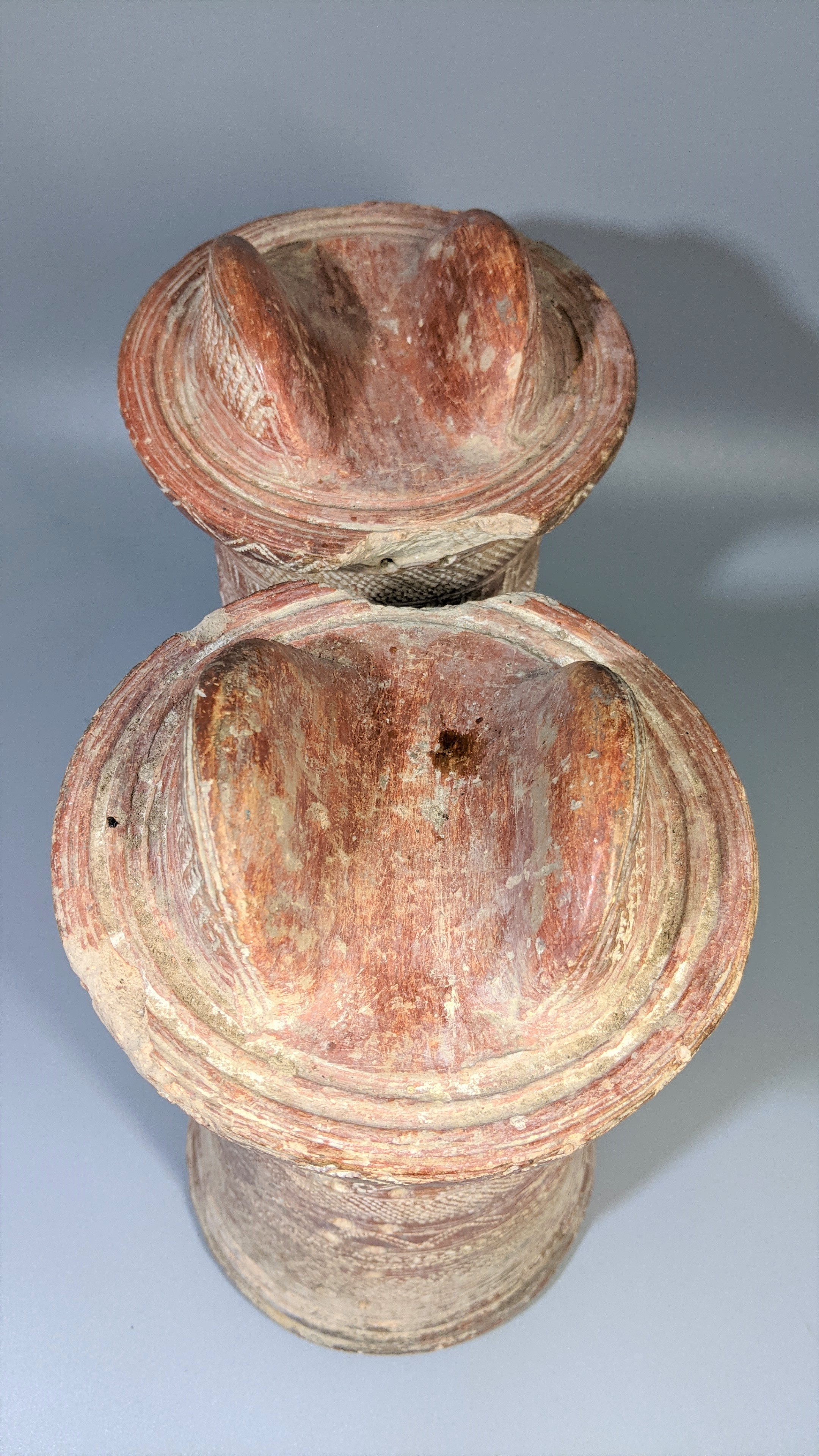 From the northern regions of the Bozo - Somono people. Often misunderstood, this pair holds up one end of a bed. Wood timber sits within the flanges at top. The timbers heading the other way were notched to lock together. So this is a pair of the original four and were instrumental in preventing or keeping any rodents off of sleeping. Profusely decorated, the thick bodies fully etched and engraved in complicated geometric designs. Both with a bite out of the top rim and base rim. 10 1/2 inches high.