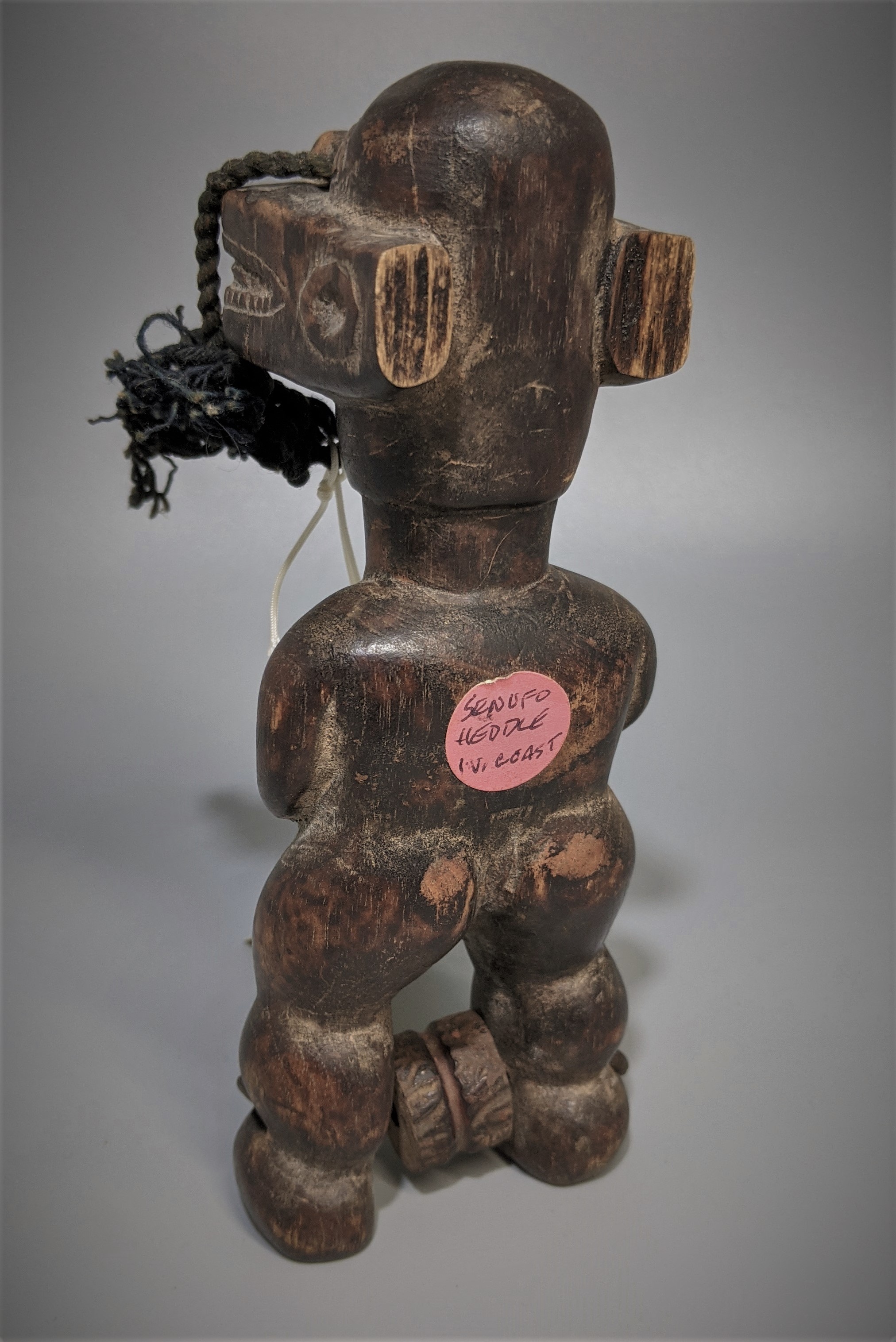 An early male figure with crocodile head. The museum has it labeled as Senufo. Rich old unclean patina, well worn from use. 7 inches high.