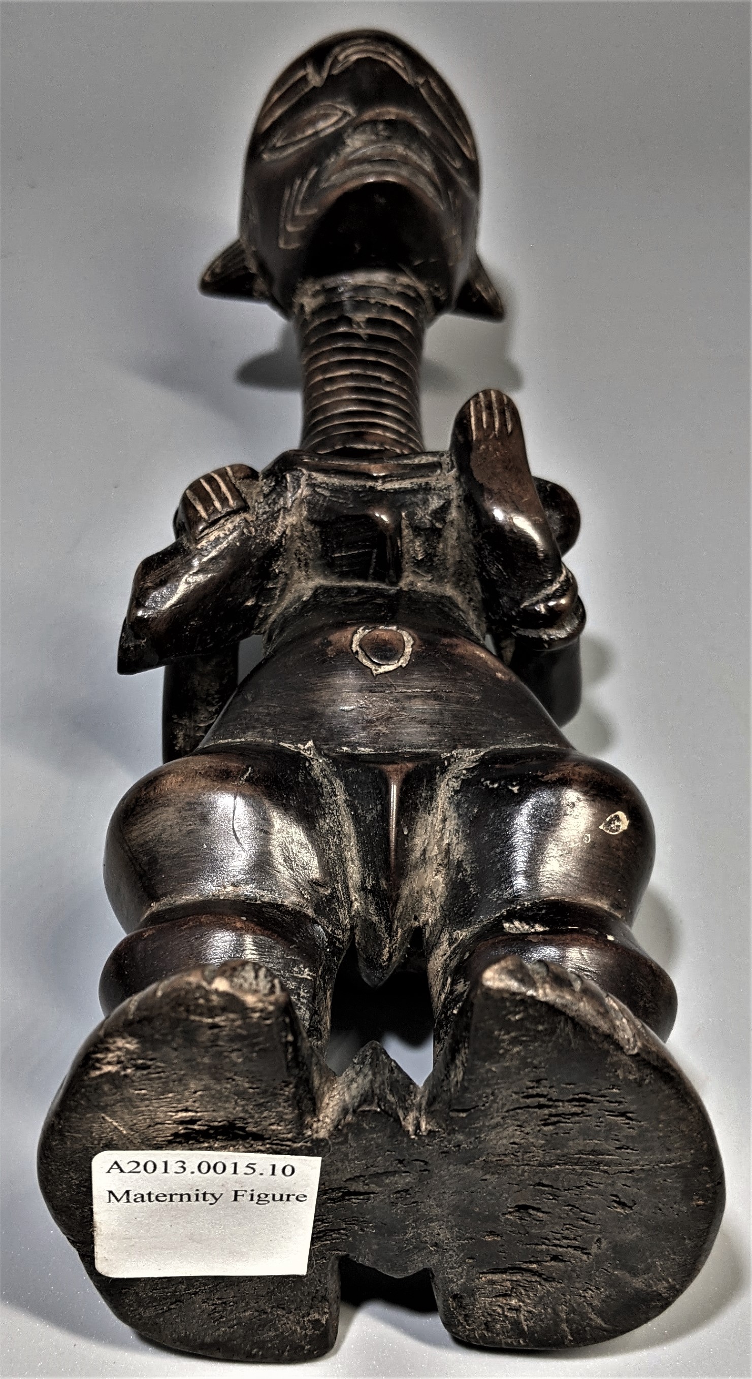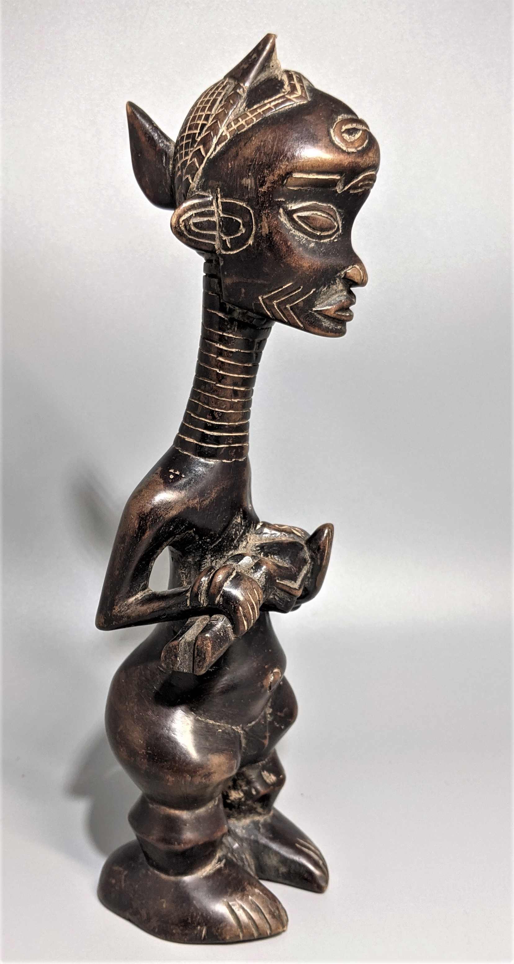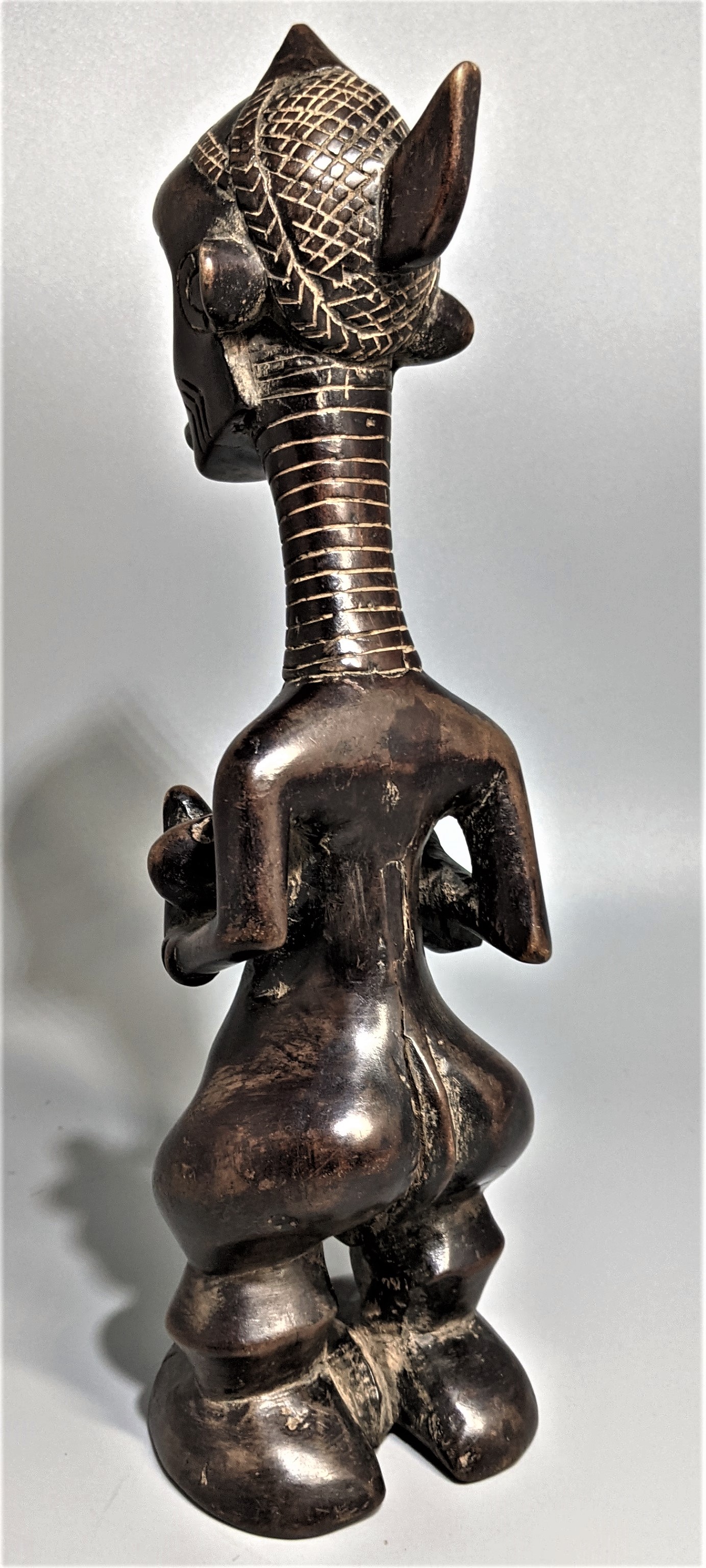Outstanding in all regards, the sophisicated carving ranks way up there among the types. Strong age, condition and near pious fidelity. A choice example. Circa 1890-1910. Superb condition. The dense and heavy wood with original polished surface. A small flake of wood out at the creast of the crown. Ex. Museum. 11.25" height.
