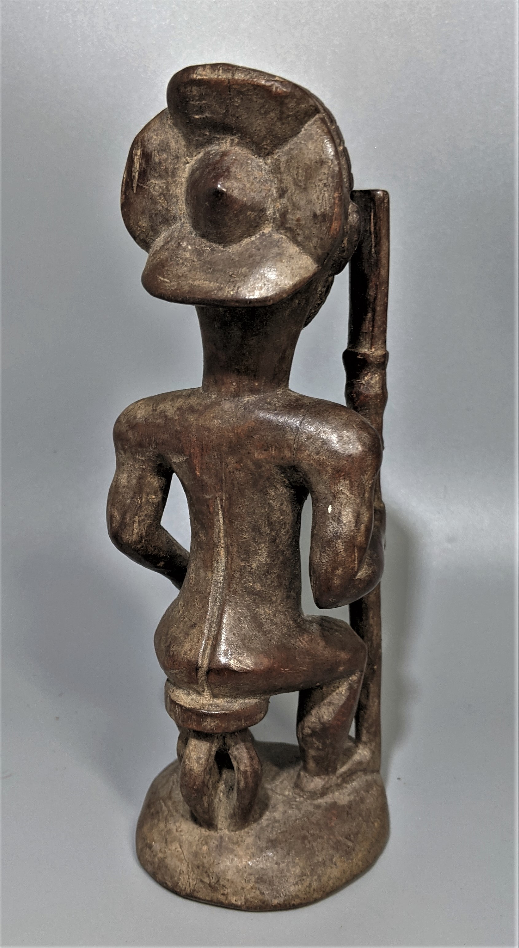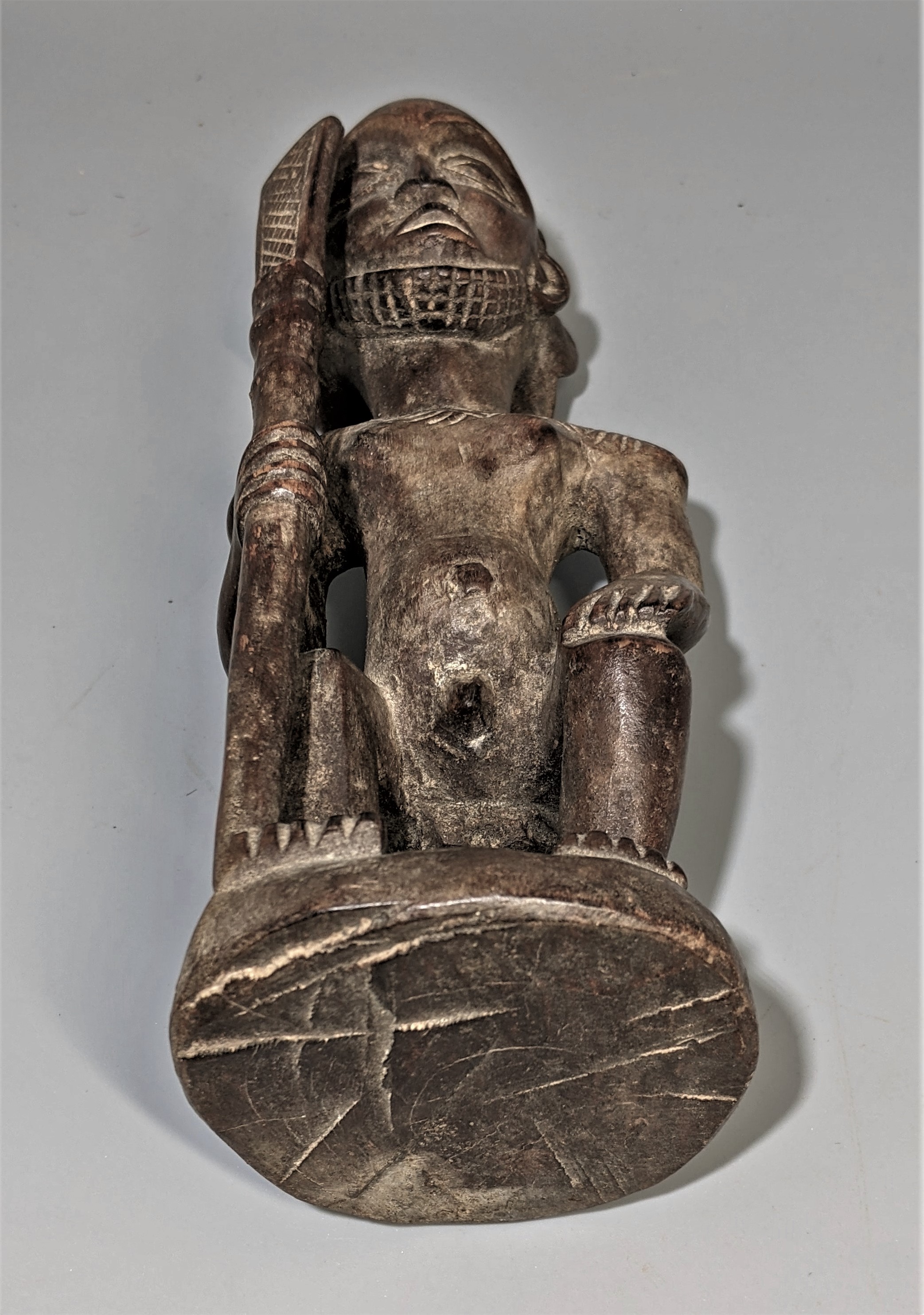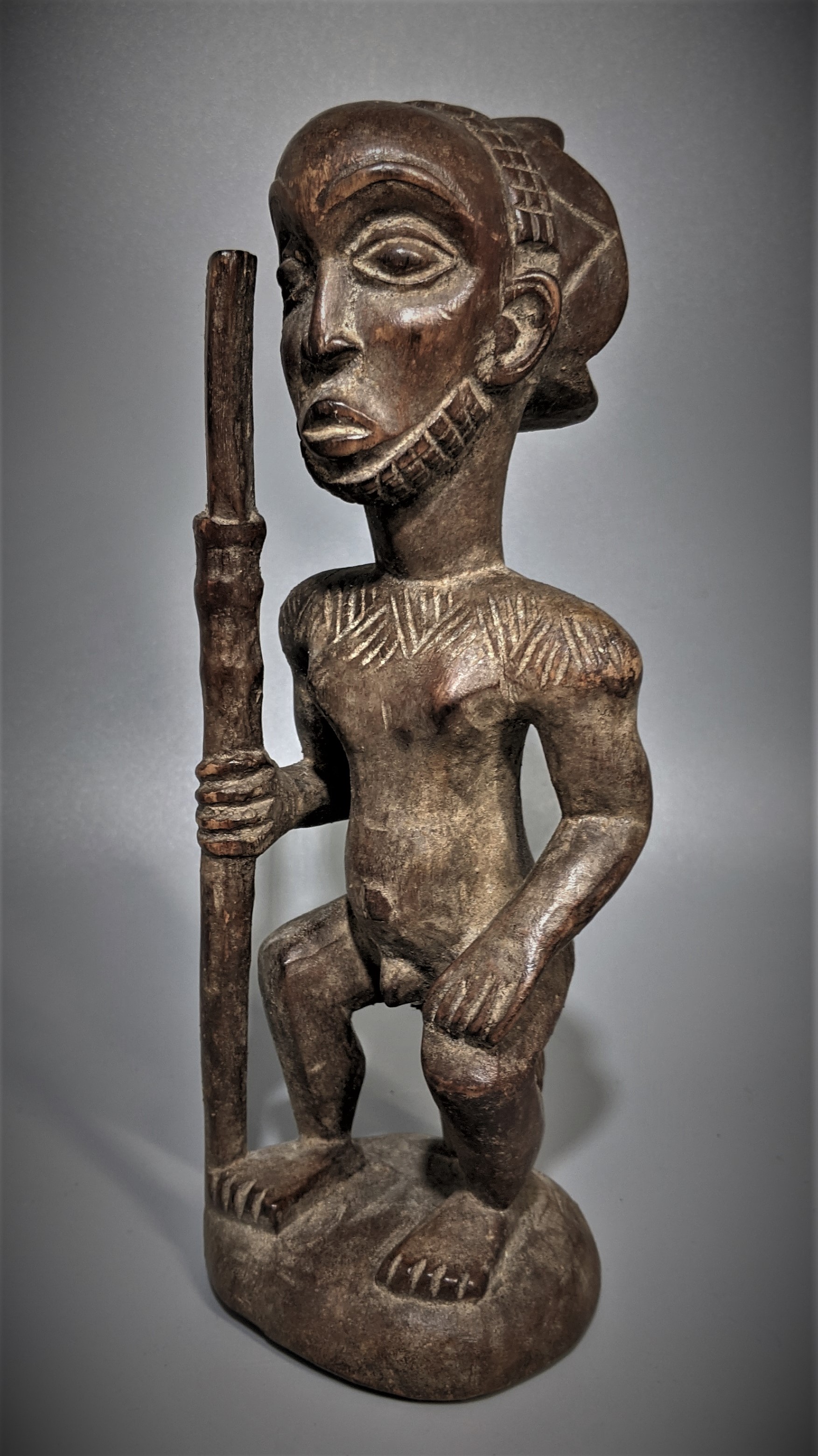 From a Master carver, a rather wonderful little guy. Bearded, om a four-legged stool, he holds a war staff. Rich and stron in every regard. Fine condition. 8" height. Modellos: Here, the start of some numerous rarities, small master carved teaching tool pieces, from numerous tribes, most all outstanding rarities which the Massachusetts Museum had a particular interest in, and built a fine and rare collection. This higher grade of items in the Massachusetts African Arts Museum put an emphasis on certain rarities, namely master carver's miniatures. These carved presentations of a type, in miniature, to be handed around and studied by the masters student’s body of carvers. The practice and generally only singular output placed these as rather coveted momentos within any tribal 'treasury' and more difficult to acquire. A goodly number, most from this collection come from African specialists in Belgium and France. In titles, where 'Modello' is written, some initial ones of these great miniature antique pieces, are here offered, most from prior museum and a few other sources.
