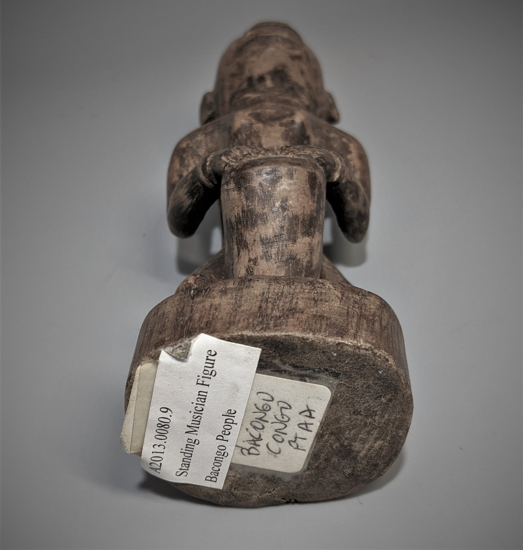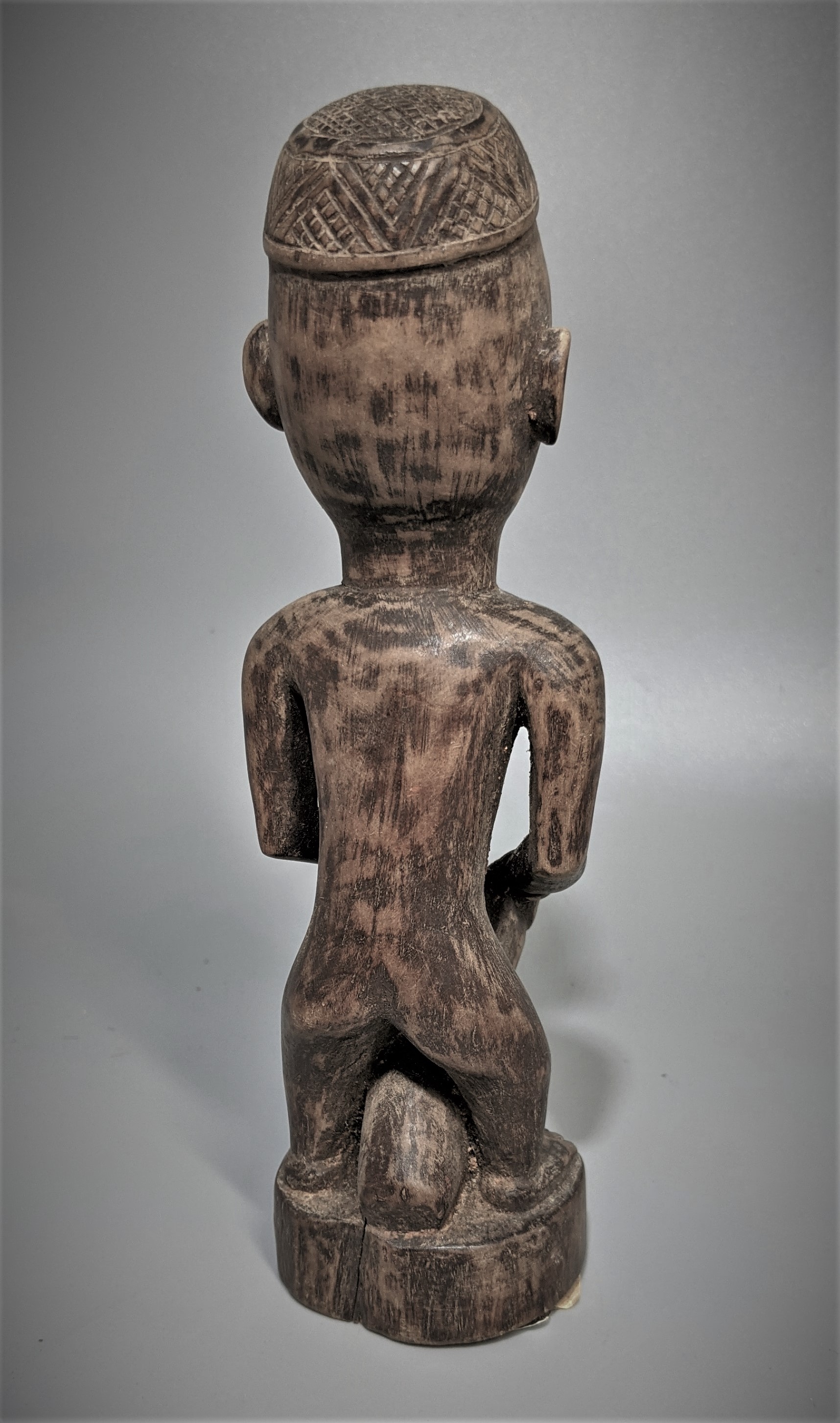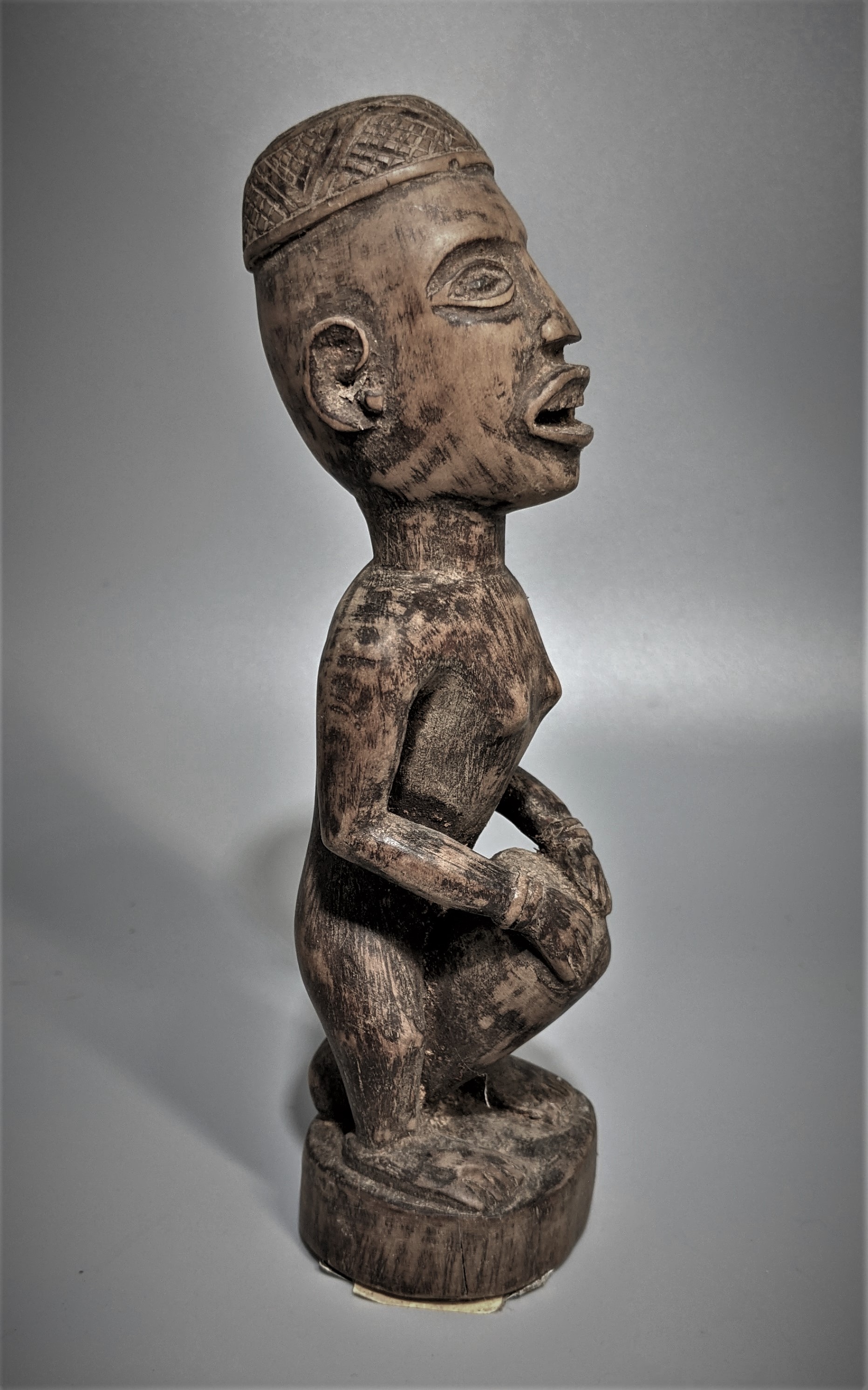 Likely cerca 1900. Well worn surface open mouth, it appears to be singing. Congo, formally Zaire. Museum info attached. 7 1/2 inches high. Modellos: Here, the start of some numerous rarities, small master carved teaching tool pieces, from numerous tribes, most all outstanding rarities which the Massachusetts Museum had a particular interest in, and built a fine and rare collection. This higher grade of items in the Massachusetts African Arts Museum put an emphasis on certain rarities, namely master carver's miniatures. These carved presentations of a type, in miniature, to be handed around and studied by the masters student’s body of carvers. The practice and generally only singular output placed these as rather coveted momentos within any tribal 'treasury' and more difficult to acquire. A goodly number, most from this collection come from African specialists in Belgium and France. In titles, where 'Modello' is written, some initial ones of these great miniature antique pieces, are here offered, most from prior museum and a few other sources.